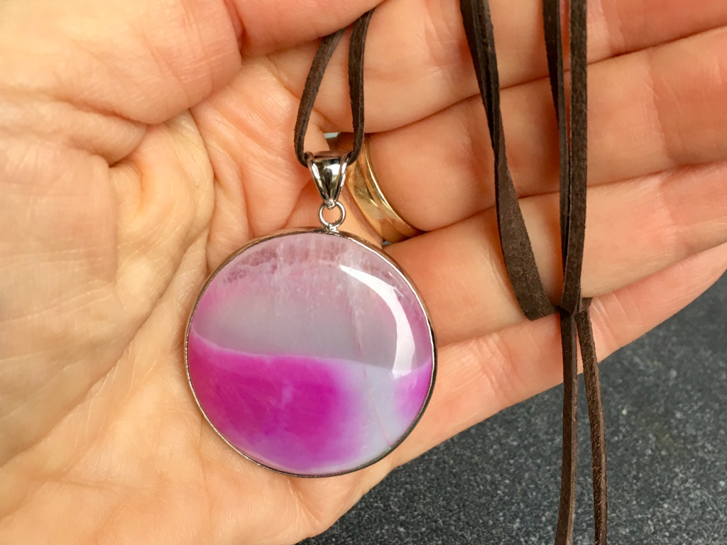 Příjemně zbarvený přívěsek z achátu v kulatém tvaru, dodá citovou, tělesnou a rozumovou rovnováhu.