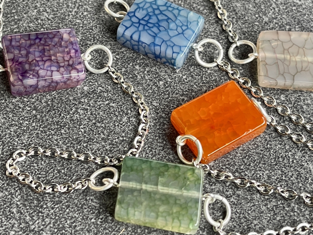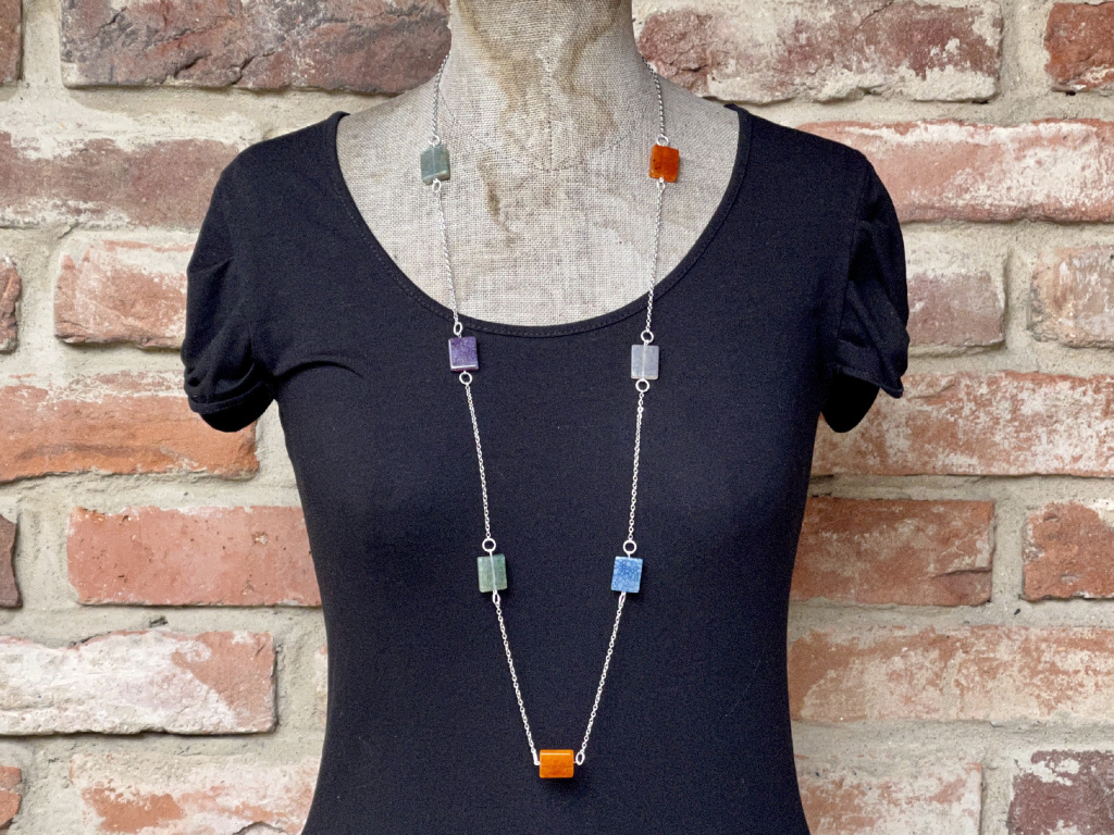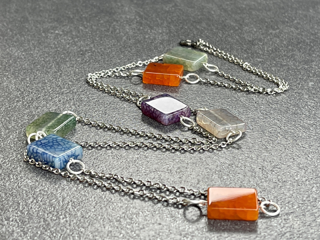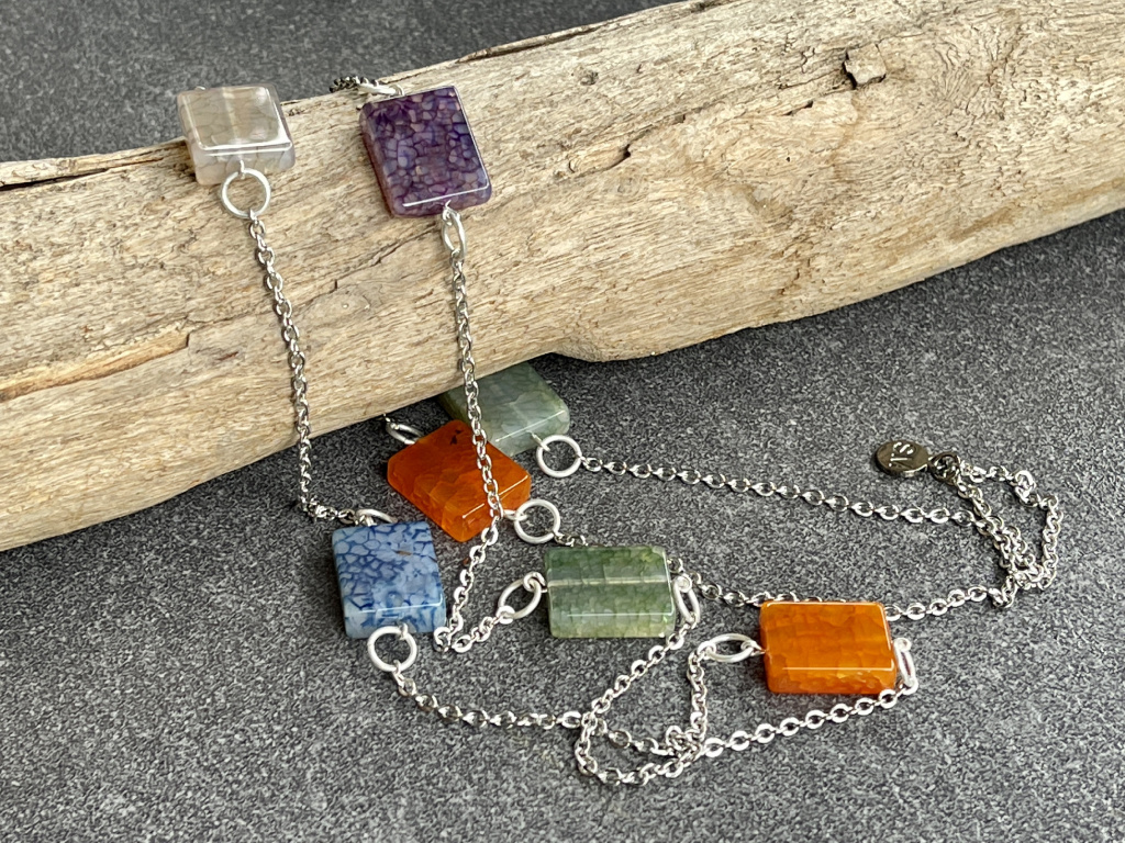 Náhrdelník z barvených achátů ve tvaru kostiček bude přinášet svému majiteli citovou, tělesnou a rozumovou rovnováhu.