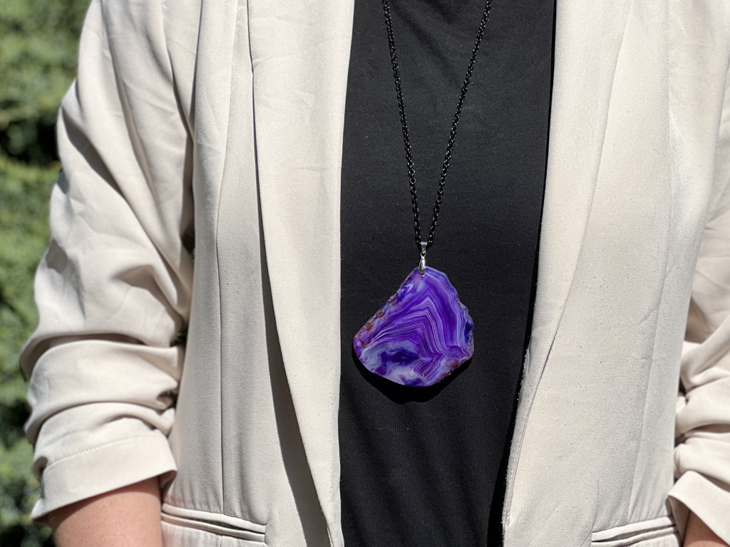 Pořiďte si náhrdelník s achátovým plátkem ve fialové barvě a přiveďte do svého života rovnováhu a čistou energii. Tento šperk je nezbytným doplňkem pro každého, kdo hledá způsob, jak zůstat vnitřně vyrovnaný a v harmonii se sebou samým i okolním světem.