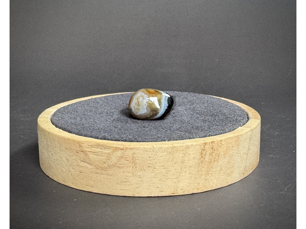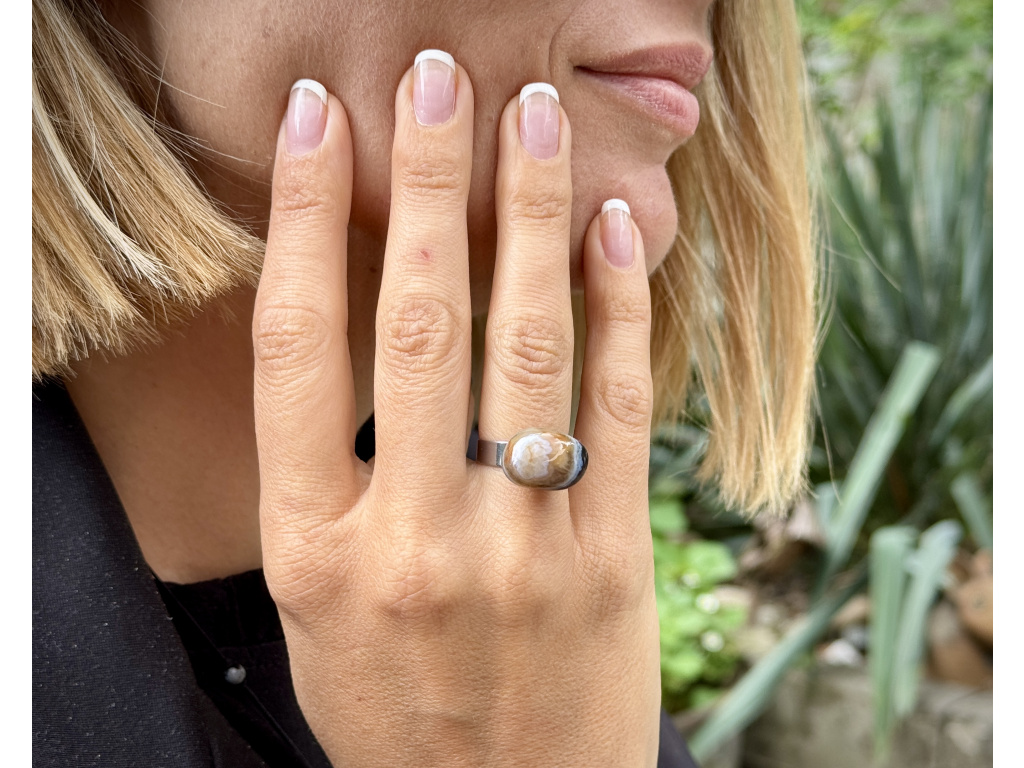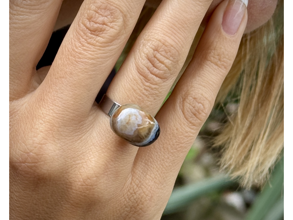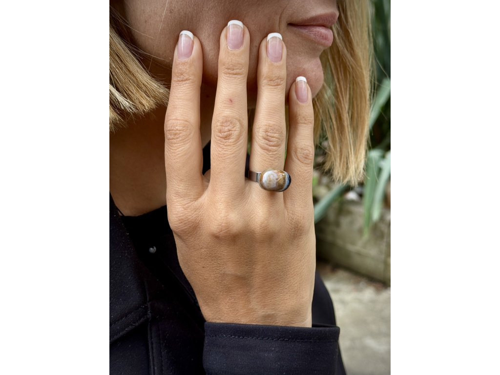 Jemný prsten s hladce tromlovaným achátem v přírodních tónech krémové, karamelové a uhlově šedé. Každý kámen kreslí jedinečné pásky a drobné geody, takže na ruce působí přirozeně a elegantně.