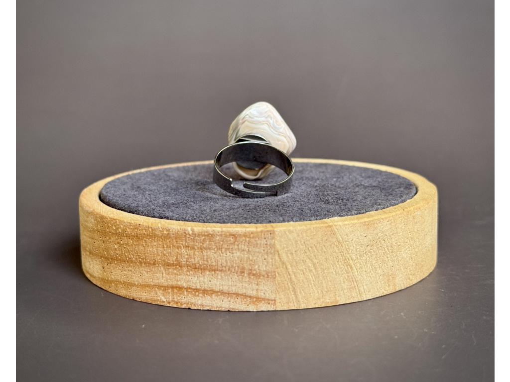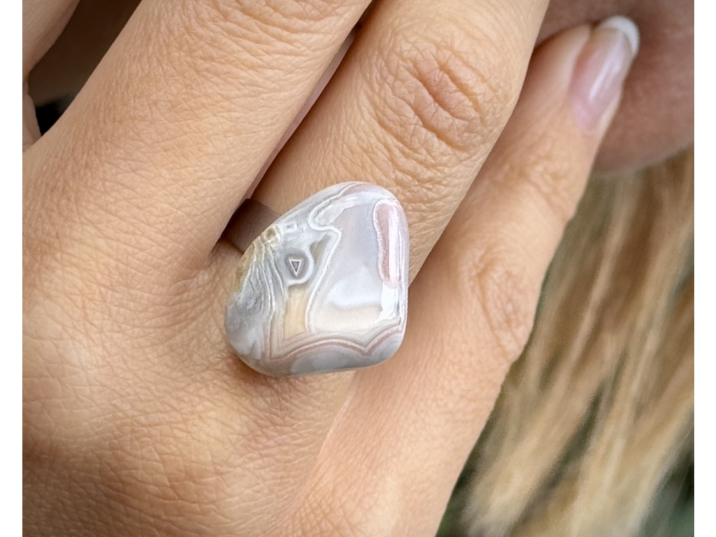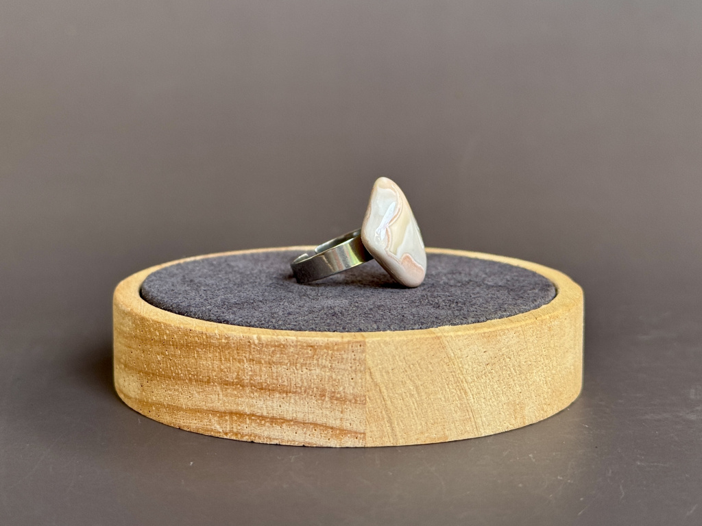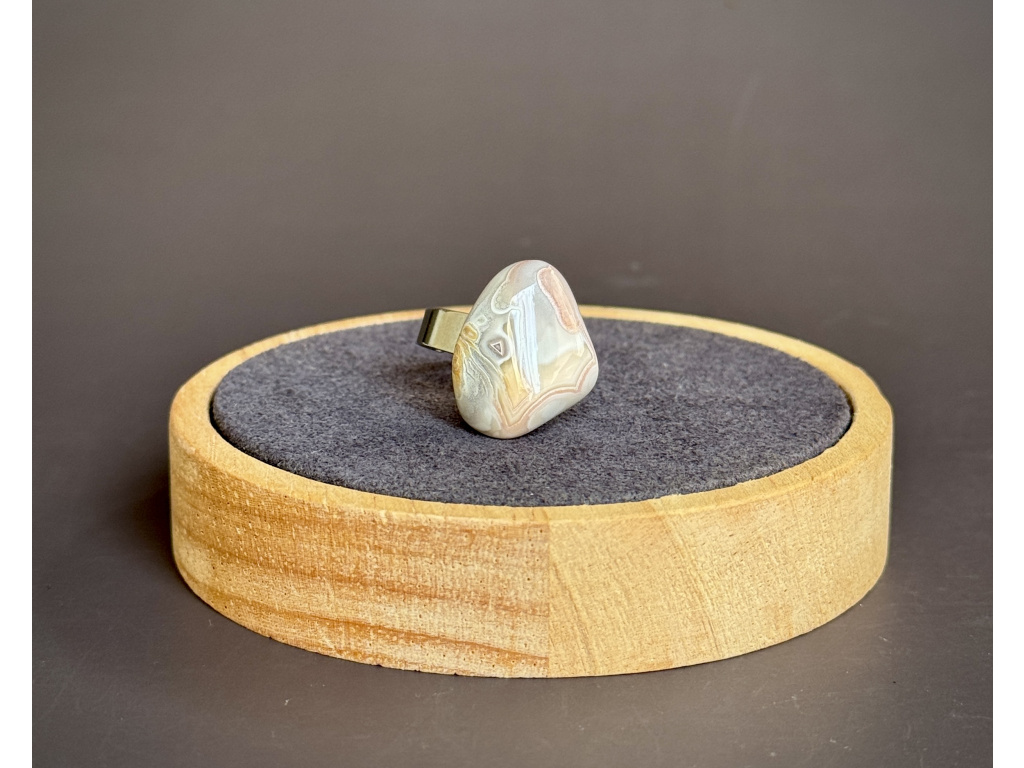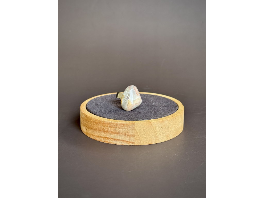 Jemný prsten s hladce tromlovaným růžovým achátem v přirozených, nedobarvovaných odstínech. Hebké páskování v tónech růžové, krémové a šedo‑béžové vytváří něžný, ženský akcent, který se snadno kombinuje s každodenním outfitem.