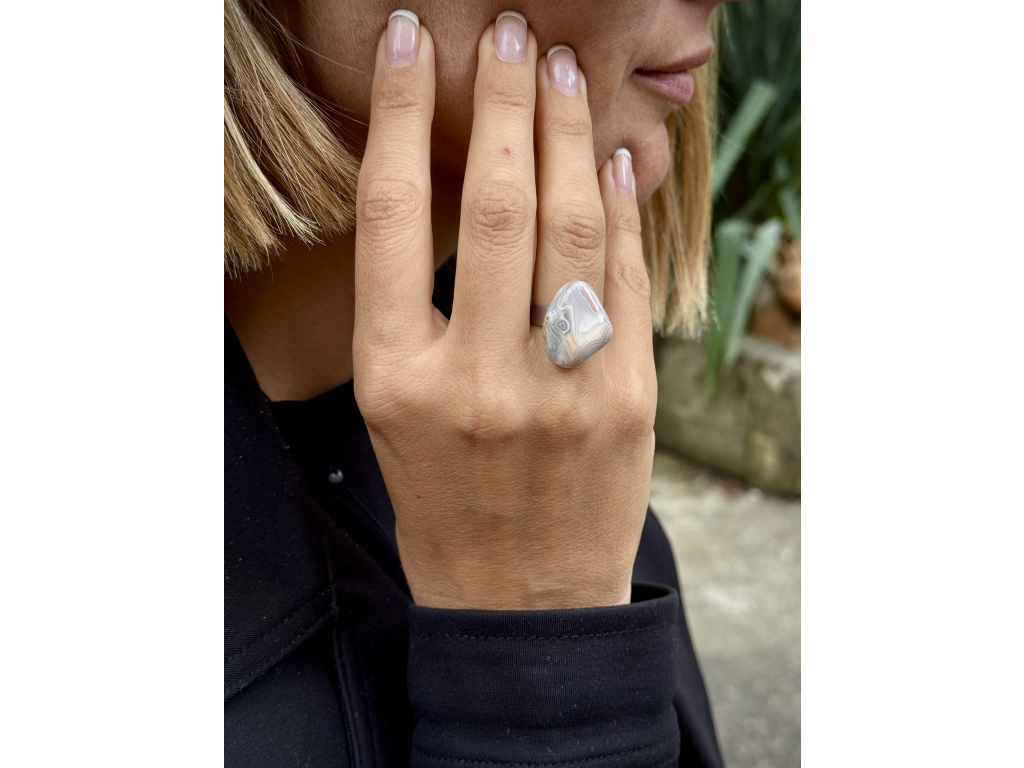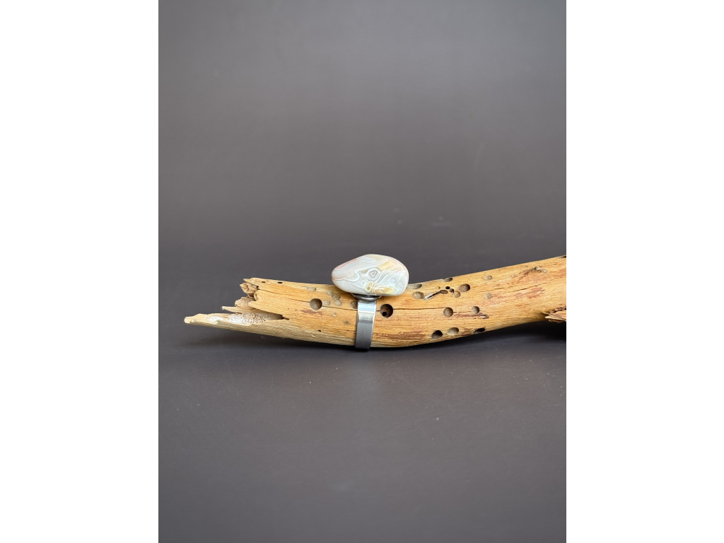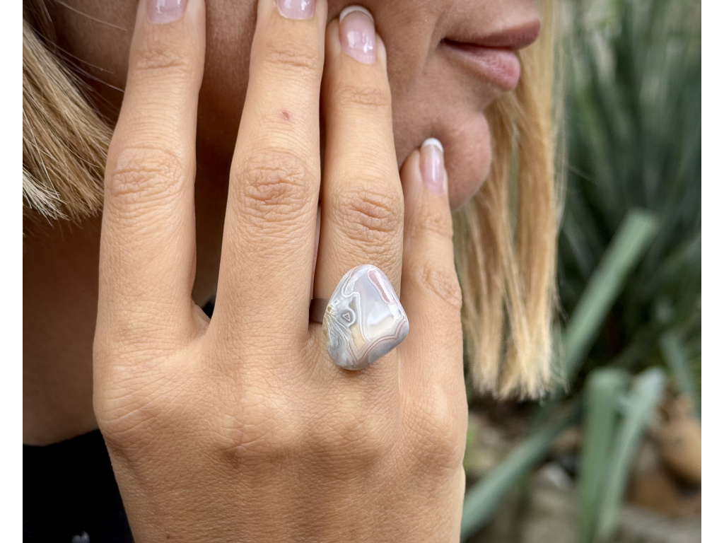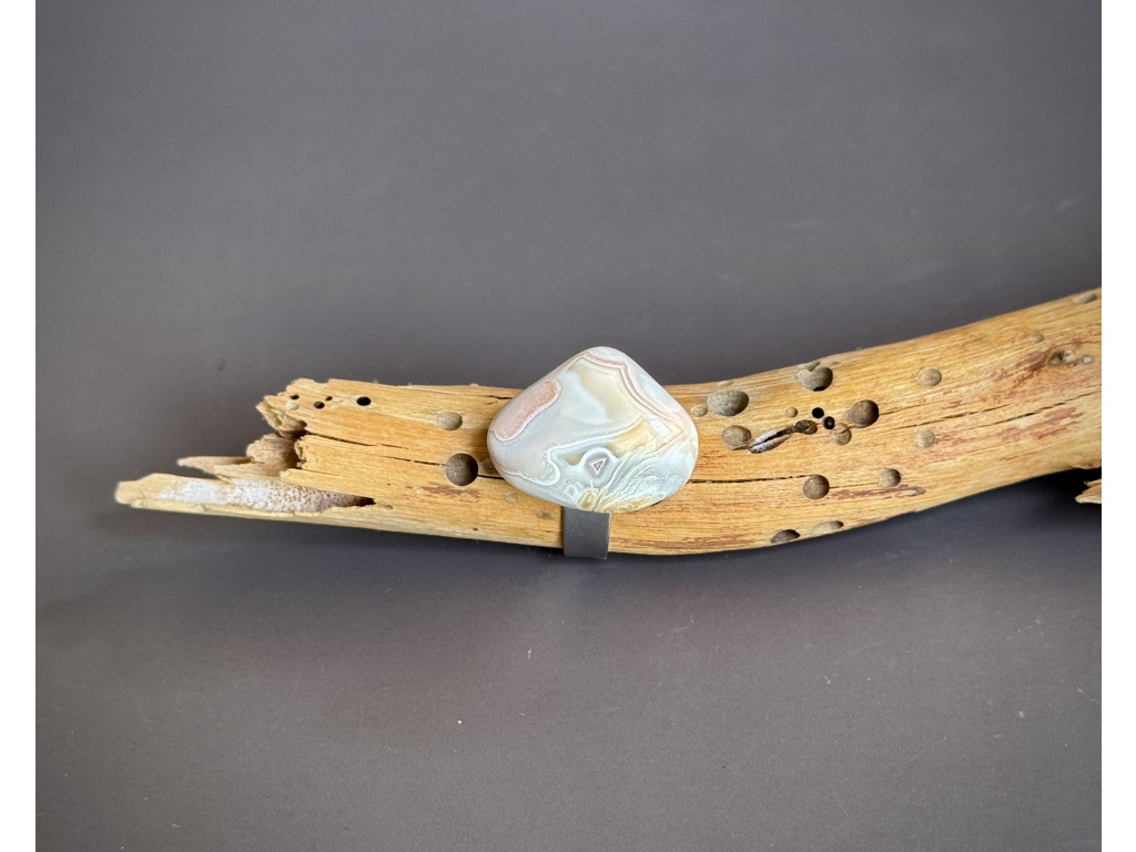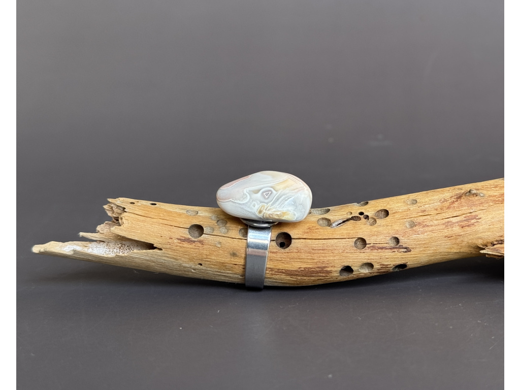 Jemný prsten s hladce tromlovaným růžovým achátem v přirozených, nedobarvovaných odstínech. Hebké páskování v tónech růžové, krémové a šedo‑béžové vytváří něžný, ženský akcent, který se snadno kombinuje s každodenním outfitem.
