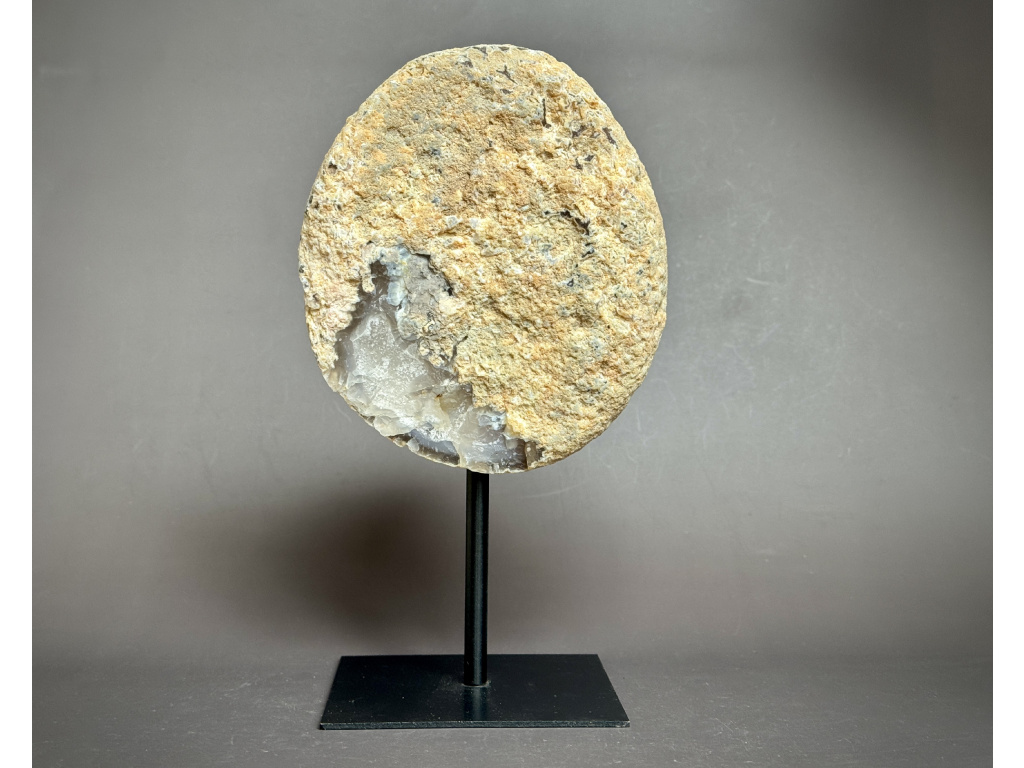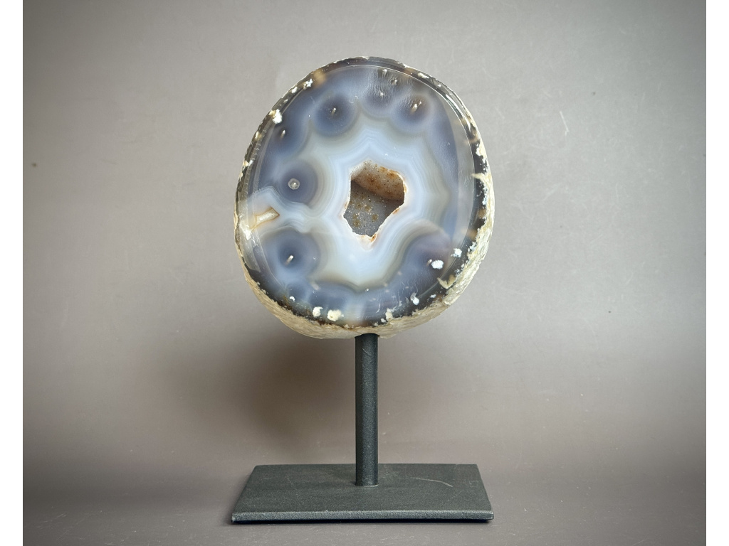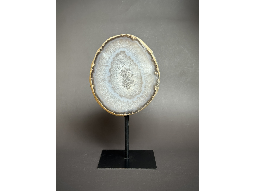 Představujeme Vám jedinečnou dekoraci, která zaujme na první pohled - achátovou půlku na kovovém stojánku s leštěnými hranami. Tento exkluzivní kus přírodní krásy je nejen okouzlujícím doplňkem do každého interiéru, ale také symbolem rovnováhy, sebedůvěry a odvahy.
