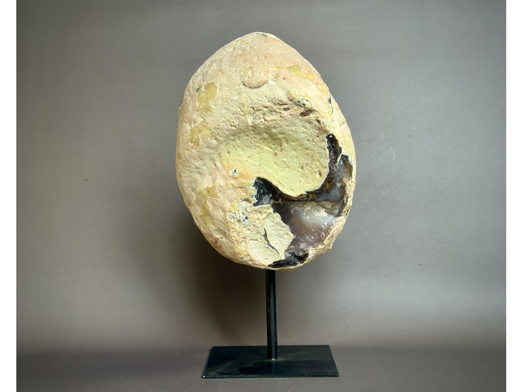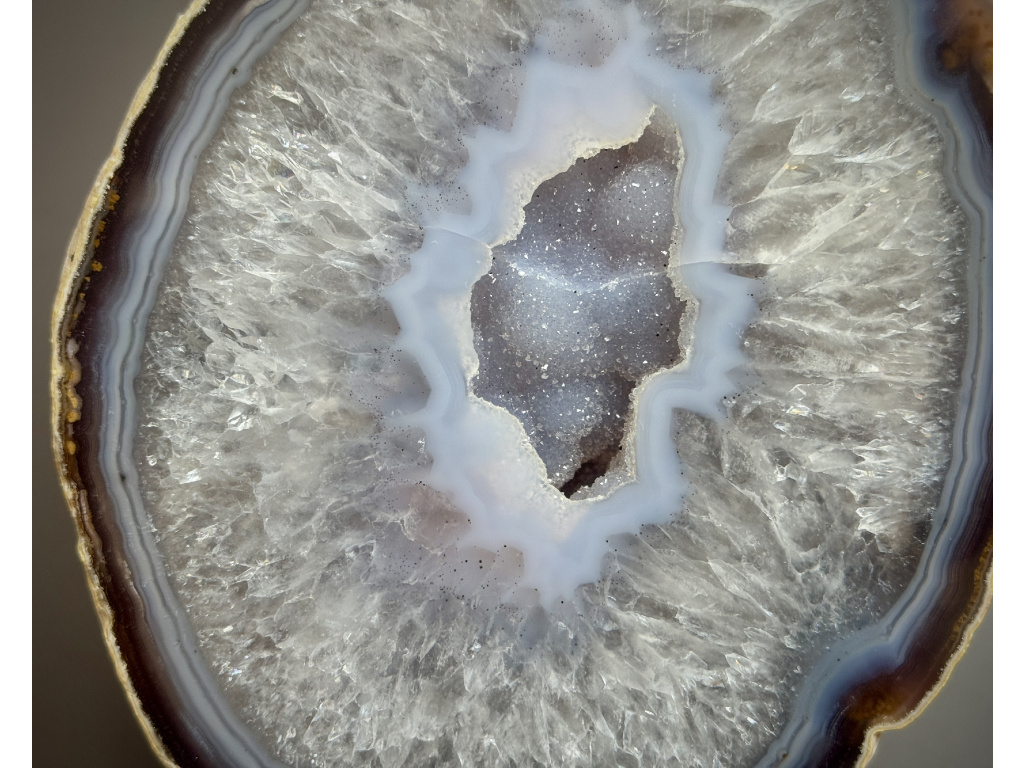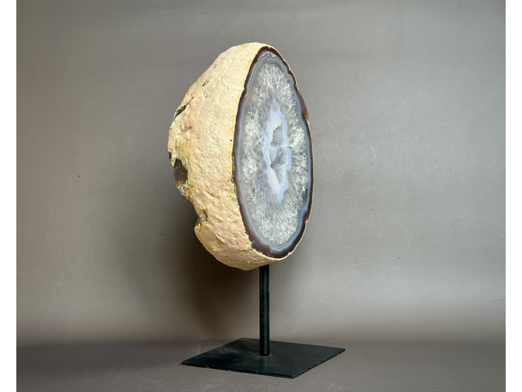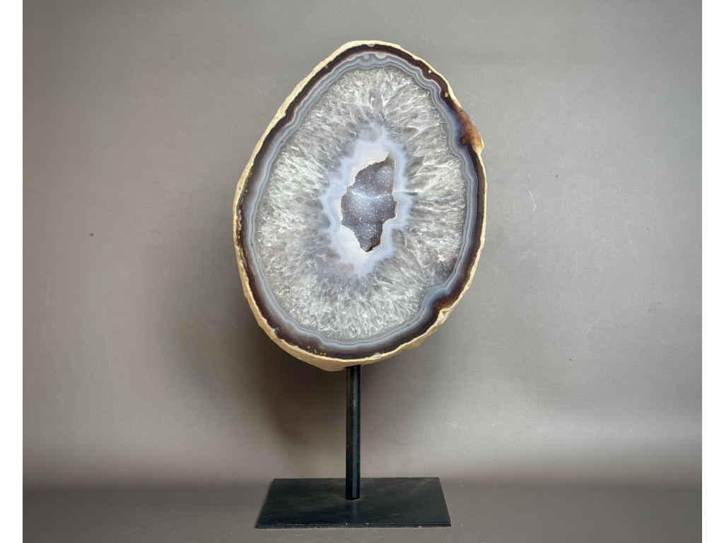Achátová geoda je symbolem rovnováhy, ochrany a klidu. Její přírodní vrstvy v odstínech šedé a bílé vyzařují harmonii a přirozenou eleganci, zatímco krystalické jádro jemně odráží světlo a pročišťuje prostor. Na kovovém stojánku se stává silným energetickým i estetickým doplňkem pro každý interiér.