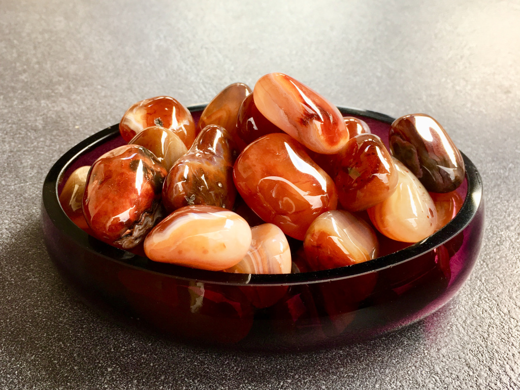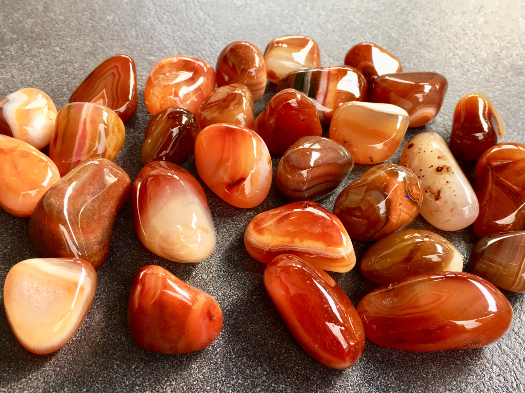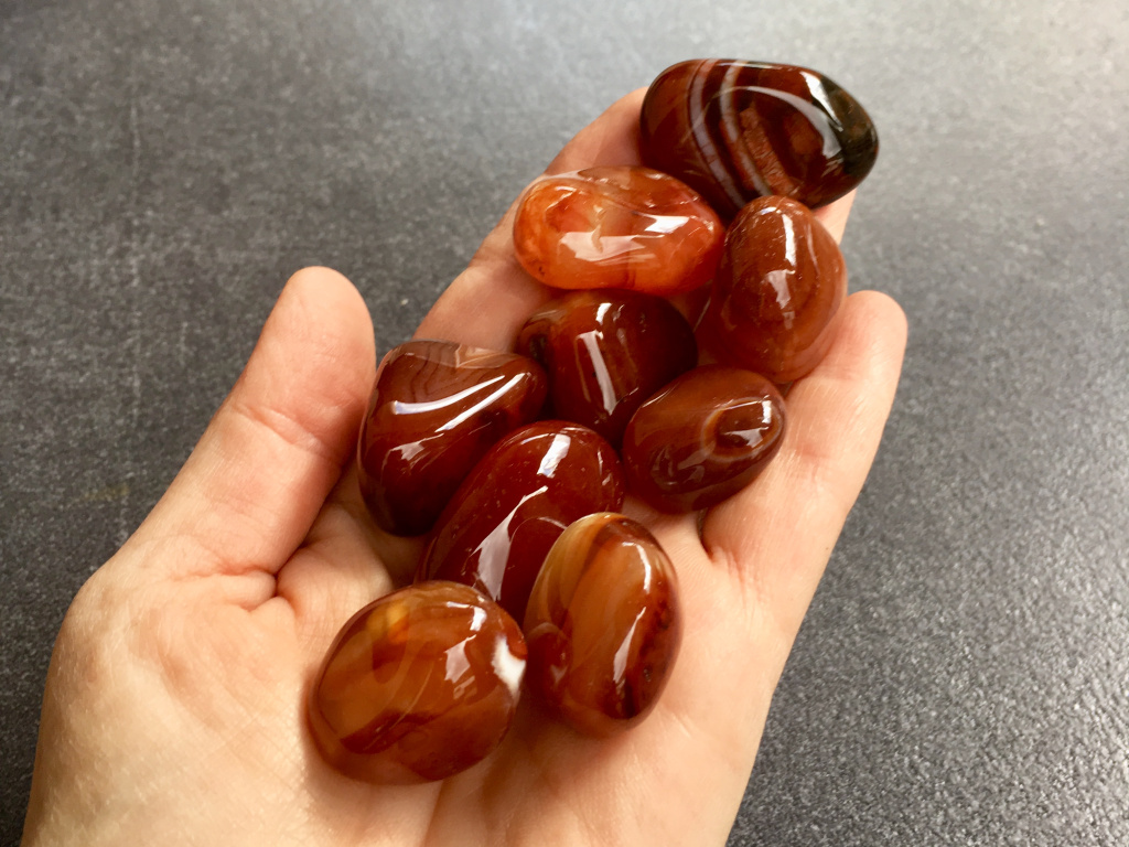 Tromlovaný barvený achát v červené barvě je stálý kámen, jenž nám dodává citovou, tělesnou a rozumovou rovnováhu. Podporuje sebedůvěru a napomáhá sebepoznání.
