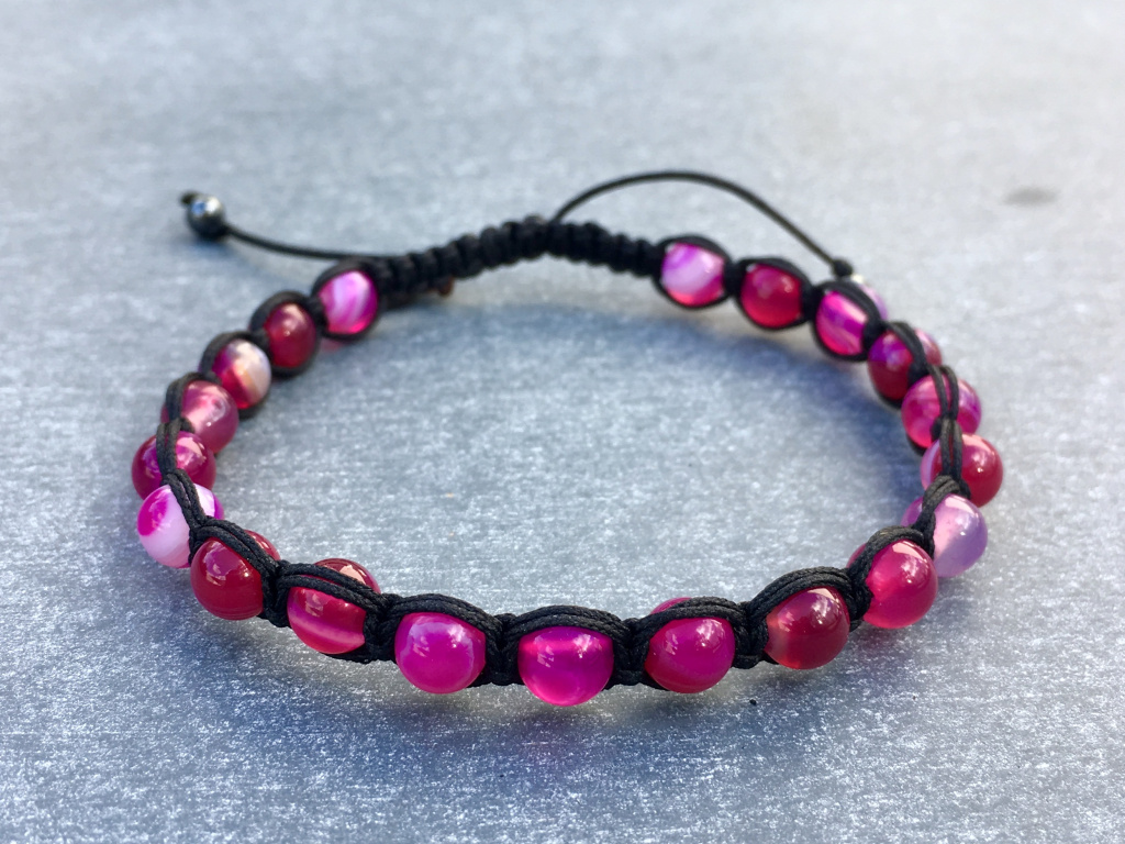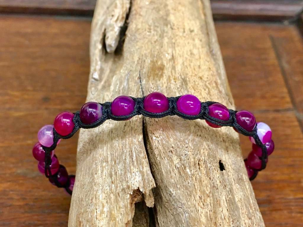 Ručně vázaný náramek z achátu v krásné fuchsiové barvě v lehkém dobarvení ve stylu shamballa, dodává citovou, tělesnou a rozumovou rovnováhu. Podporuje sebedůvěru a napomáhá sebepoznání.