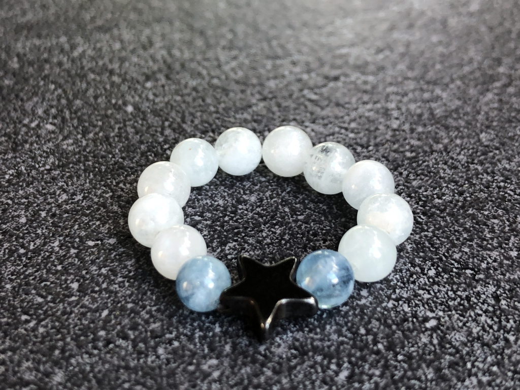 Prstýnek z akvamarínu s hematitovou hvězdičkou přináší naději a lásku, vnáší do naší mysli pocit spokojenosti. Zmírňuje podrážděnost a agresivitu.