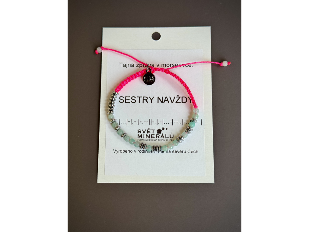 SESTRY NAVŽDY – NÁRAMEK Z AMAZONITU A HEMATITU V MORSEOVĚ ABECEDĚ