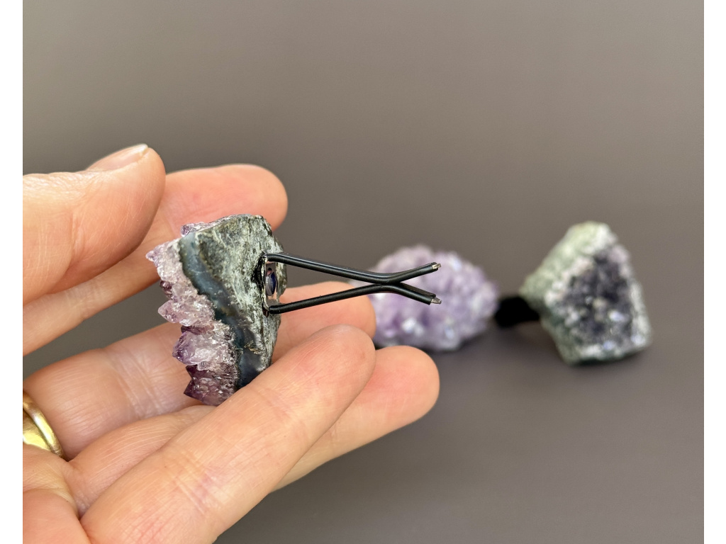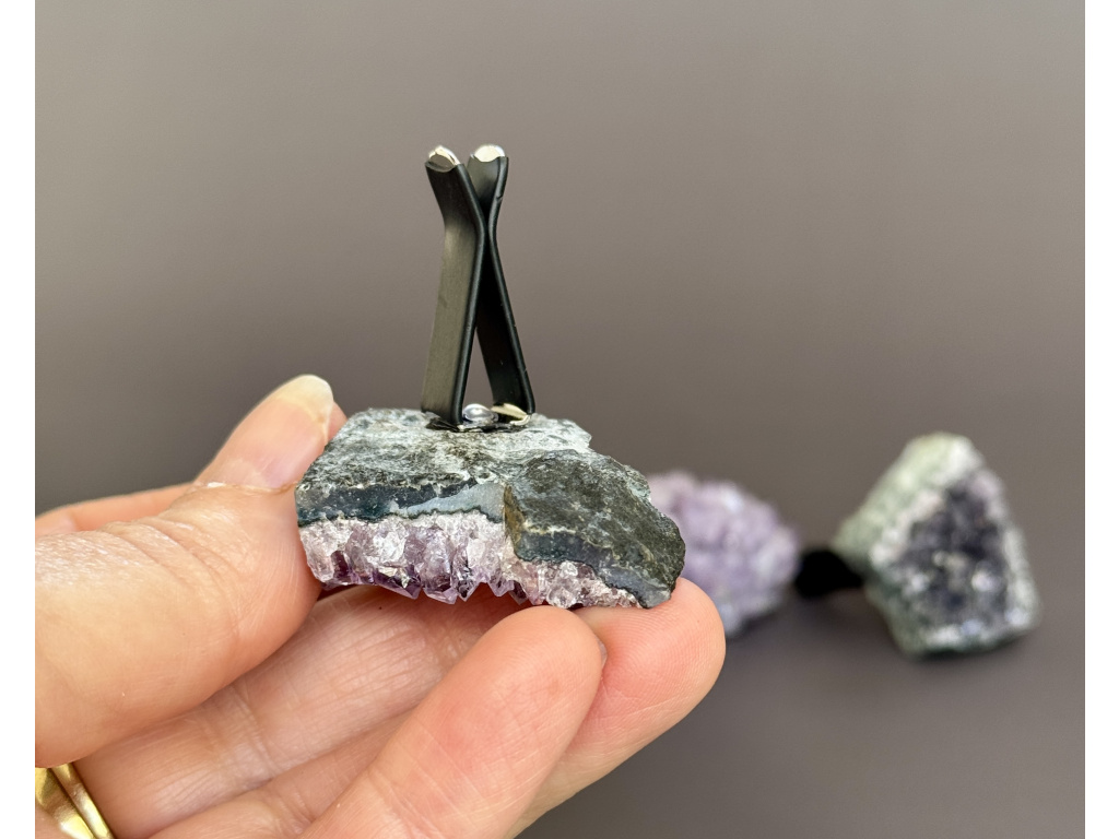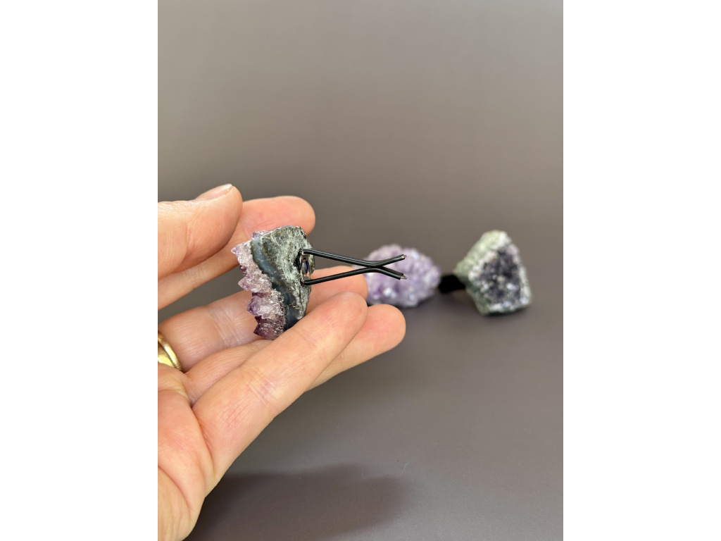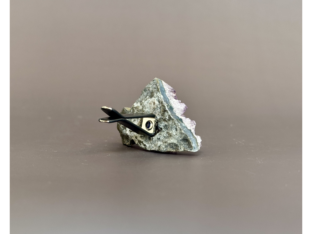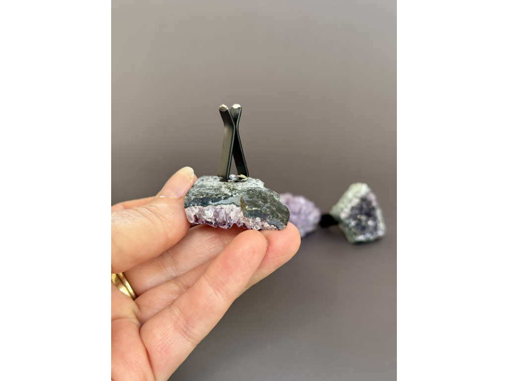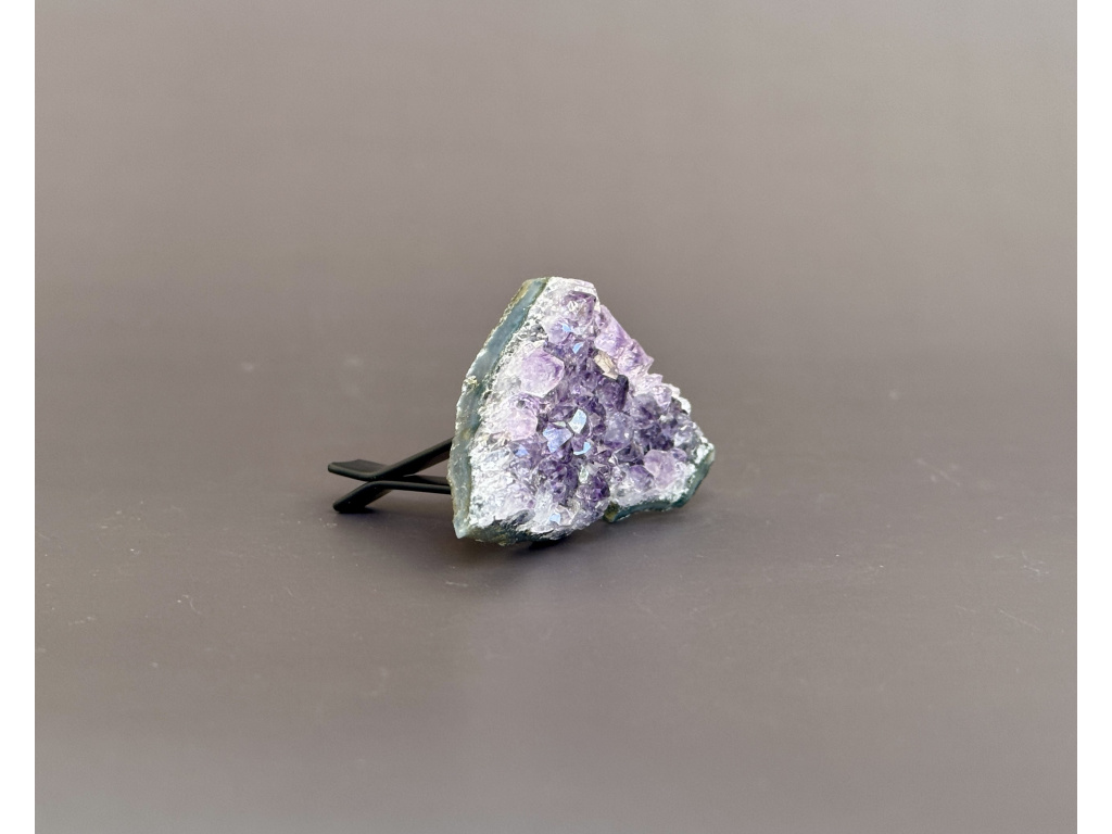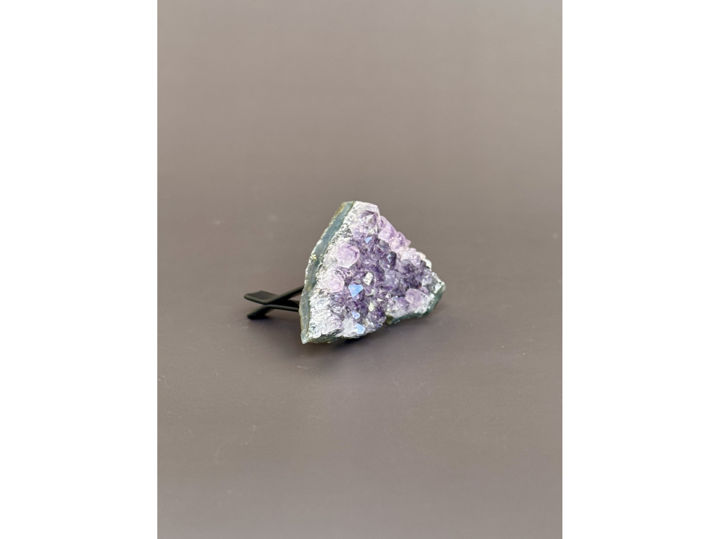 Ametyst je odrůda křemene známá svým krystalovým leskem a barevnou škálou od světle levandulové po hlubokou fialovou. Tradičně je spojován se zklidněním mysli, podporou soustředění a očistou prostředí – ideální společník do městského provozu i na delší trasy.