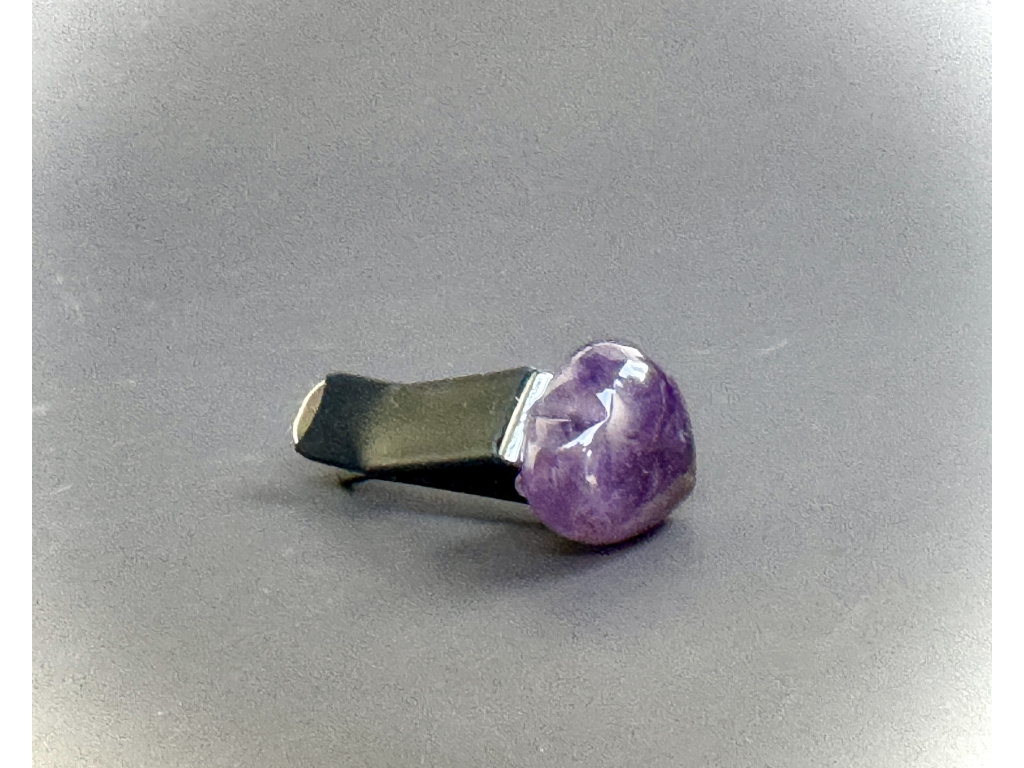 Ametyst je odrůda křemene známá svým krystalovým leskem a barevnou škálou od světle levandulové po hlubokou fialovou. Tradičně je spojován se zklidněním mysli, podporou soustředění a očistou prostředí – ideální společník do městského provozu i na delší trasy.