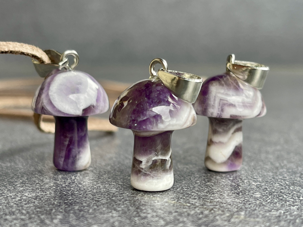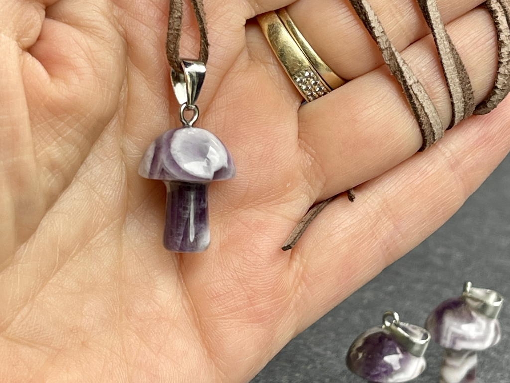 Okouzlující přívěsek z ametystu chevron ve tvaru houby spojuje duchovní sílu ametystu s energií růstu a propojení se zemí. Kresba fialových a bílých vrstev připomíná vzory přírody a jemně vyzařuje klid a harmonii. Tato drobná houba z kamene je symbolem proměny, intuice a ochrany.
