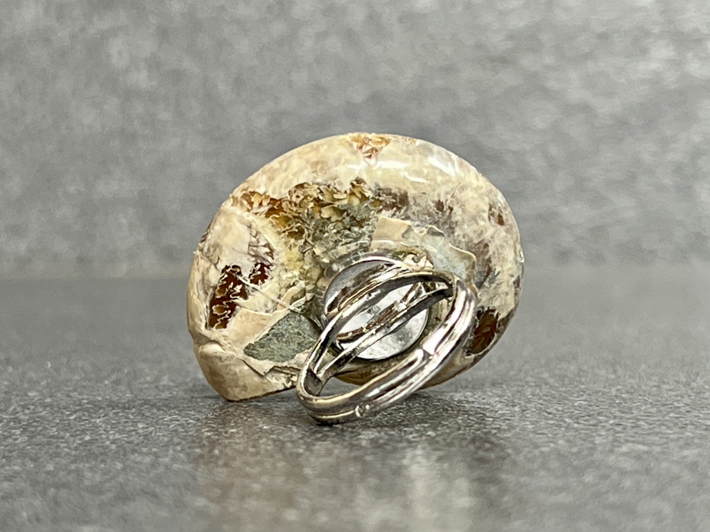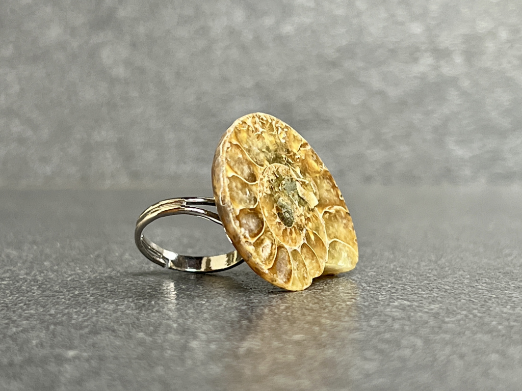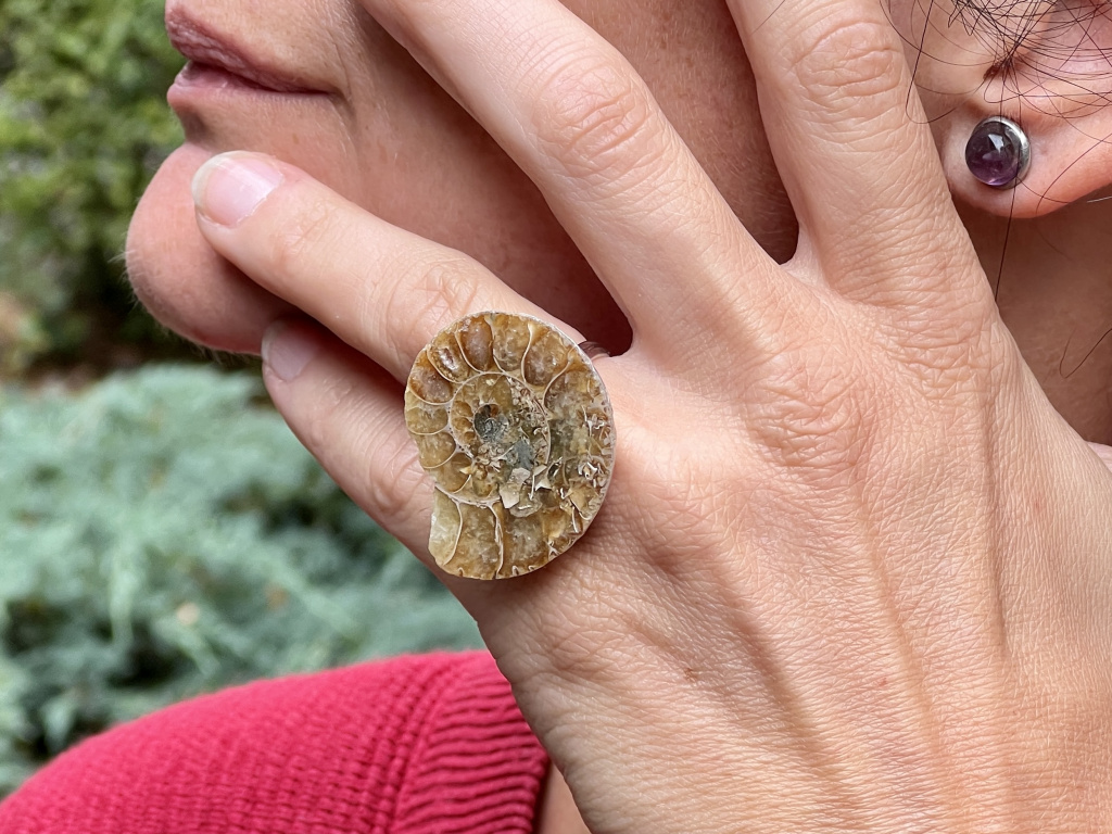Výrazný prsten s autentickým zkamenělým amonitem – fascinující spirálou starou desítky milionů let. Teplé zemité tóny a přirozená komůrková kresba dělají z každého kusu jedinečný talisman.