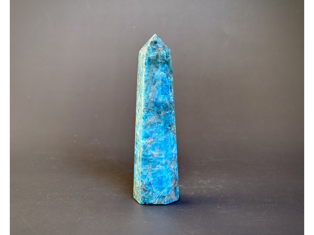 Tyrkysově modrý apatit v tvaru hrotu přitahuje pozornost živou barvou i krystalickou kresbou. Je to elegantní solitér na pracovní stůl, oltářík i do prostoru, kde chcete podpořit soustředění a tvůrčí proud.
