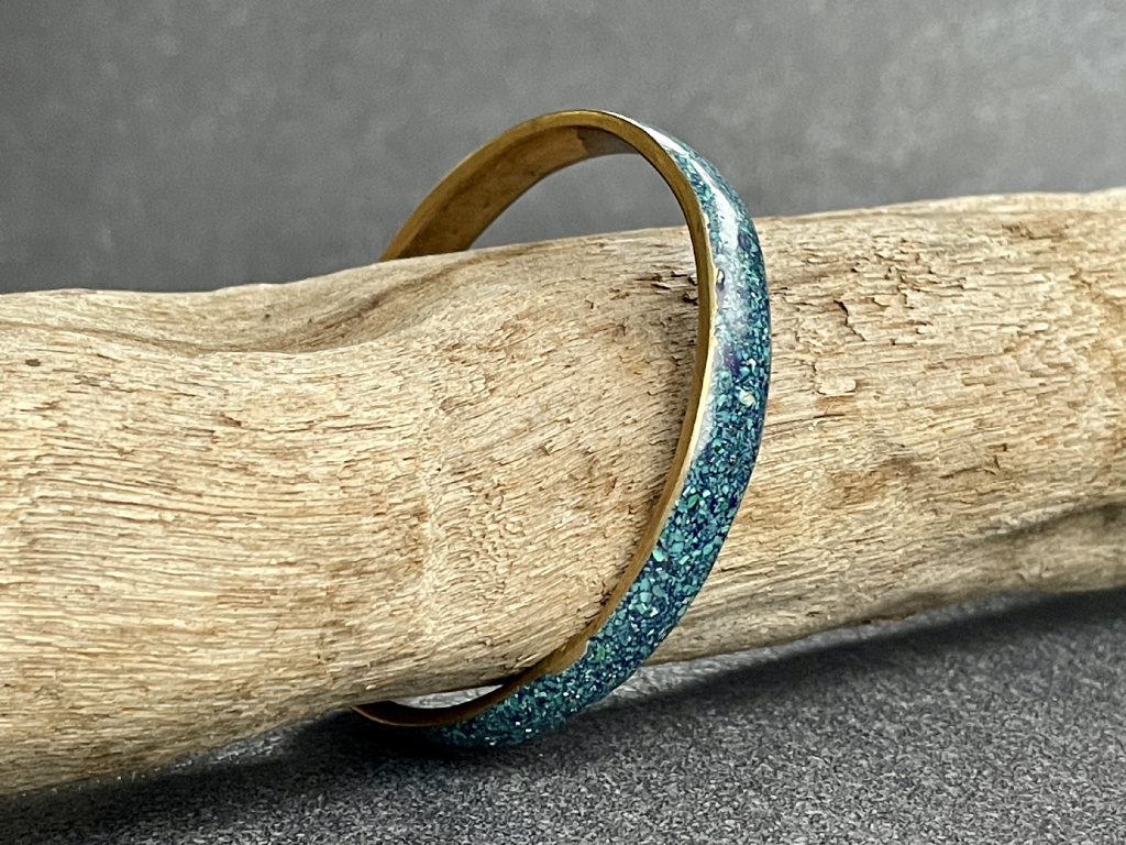 Objevte jedinečné spojení síly a elegance s náramkem z rekonstruovaného azuromalachitu. Tento poutavý šperk v sobě nese energii dvou silných kamenů – azuritu a malachitu – které jsou pečlivě zpracovány do podoby jemného třpytivého pásku, zasazeného do zlatavé obroučky.