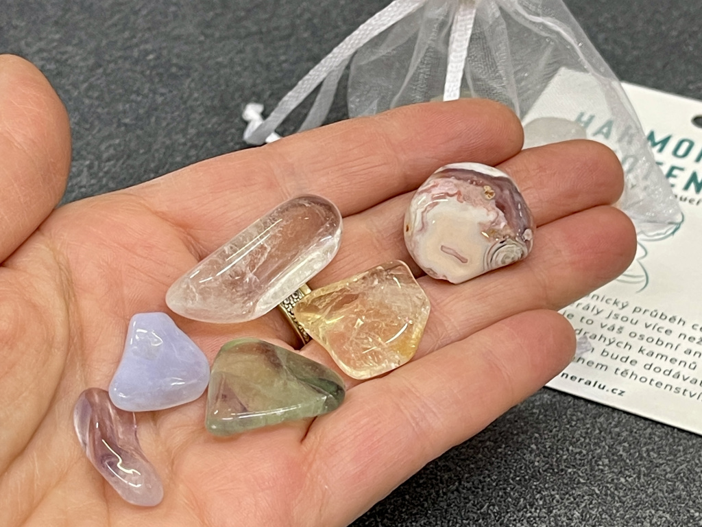 Každý kámen v tomto balíčku byl pečlivě vybrán pro jeho jedinečné vlastnosti, které přispívají k fyzické i psychické pohodě budoucí maminky. Zažijte pocit bezpečí a jistoty s achátem, nechte citrín rozjasnit vaše dny jeho pozitivní energií, fluorit ochrání vaši mysl před stresy a obavami, získejte sílu a sebevědomí s chalcedonem, nabijte se energií a klidem díky křišťálu a nechte ametyst bdít nad vaším klidným spánkem.