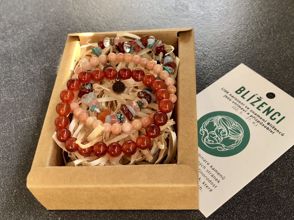 Speciálně sestavený set 3 náramků pro ženy (i muže) je přesně poskládán pro všechny vnímavé a přizpůsobivé Blížence. Sada je sestavena tak, aby jednotlivé náramky tvořili barevně ladící celek, je ale možné sáhnout po jednom či dvou podle momentální nálady. Síla náramků spočívá v potlačení slabých stránek, které se odráží v rychlých změnách a podpoře těch silných jako je komunikace, silný rozhled a činorodost.
