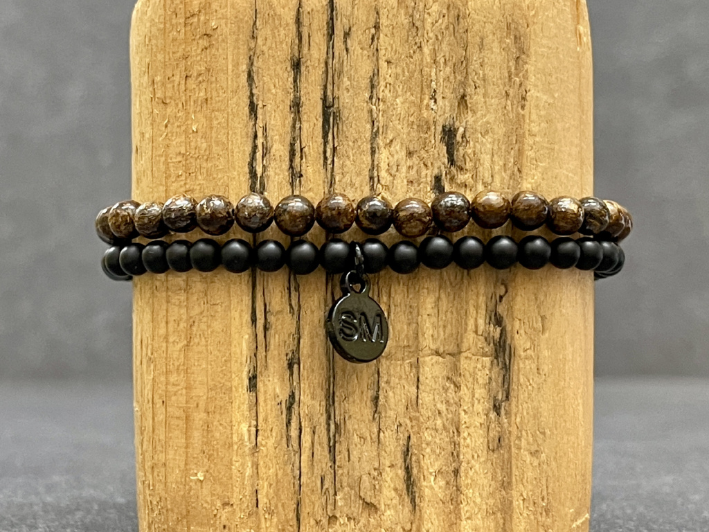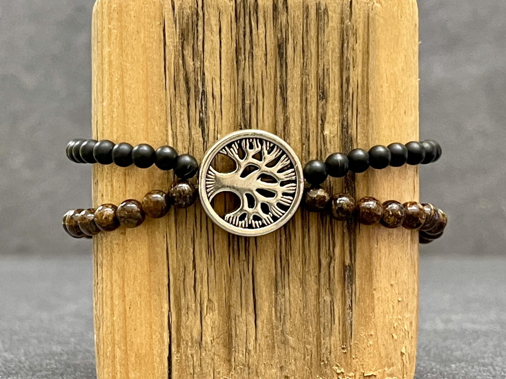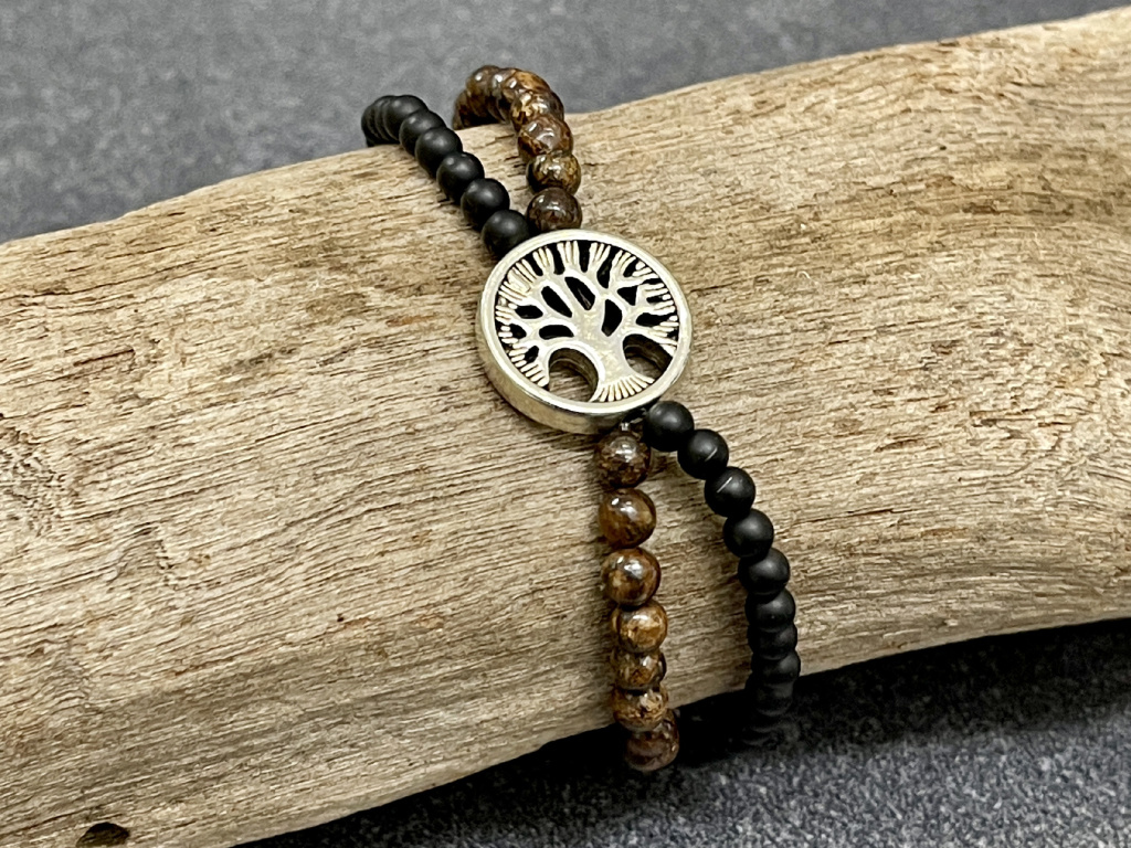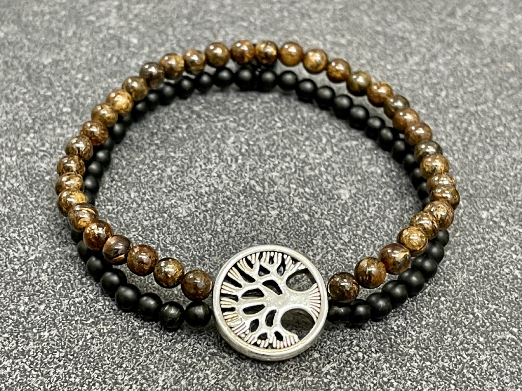 Bronzit, achát černý mat náramek "Strom života" - kulička 4 mm