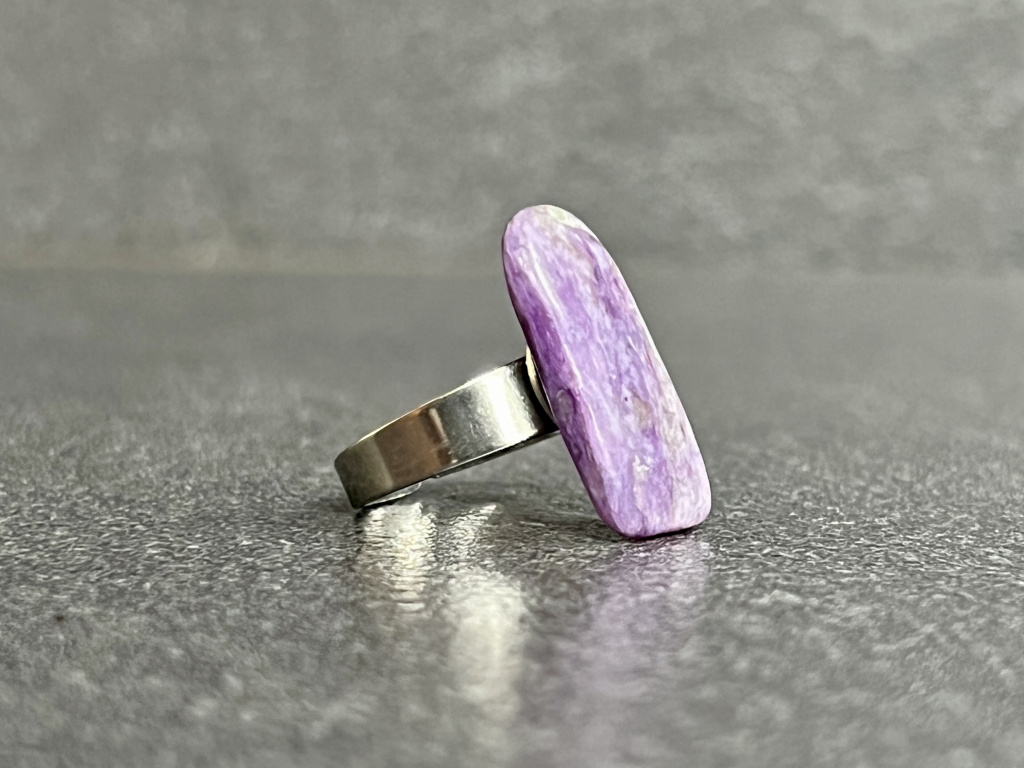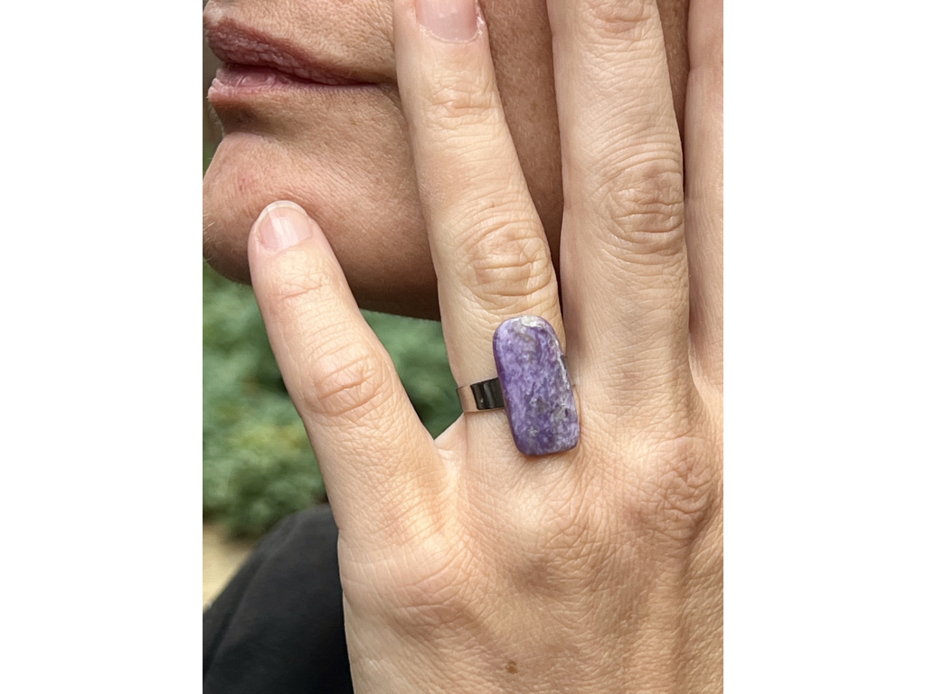Elegantní prsten s leštěným kouskem čaroitu v odstínech fialové s jemným mramorováním. Kámen působí sametově a na ruce vytváří sofistikovaný, výrazný akcent.