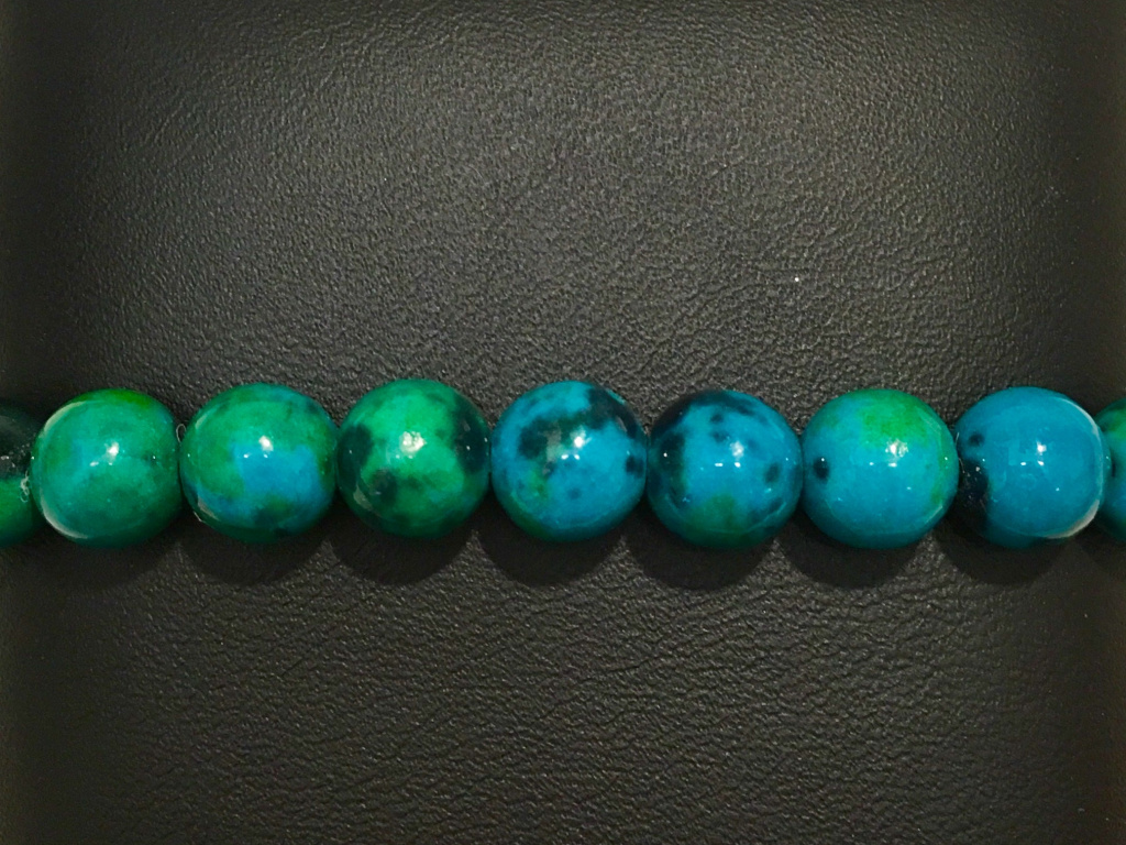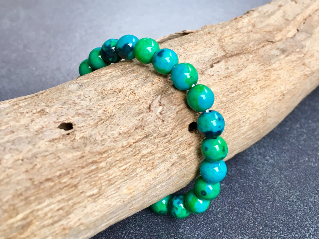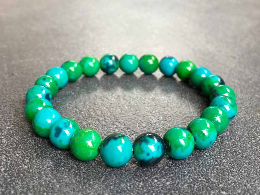 Náramek z krásného chryzokolu Kongo z kuliček ve velikosti 8 mm, vyhání negativní energie všeho druhu a má blahodárný účinek na vztahy.