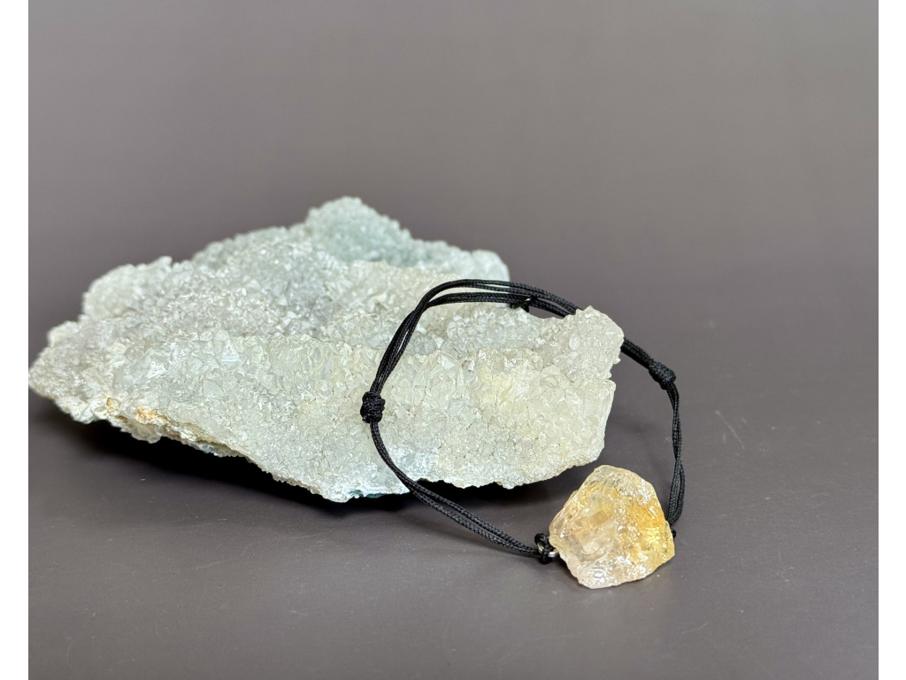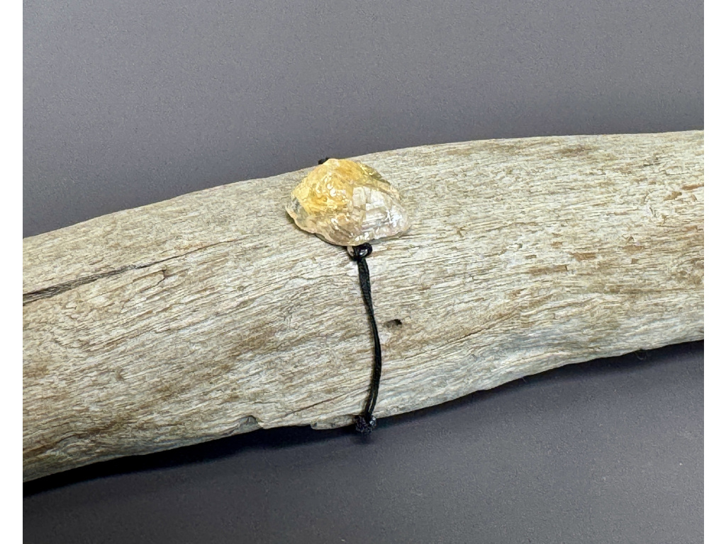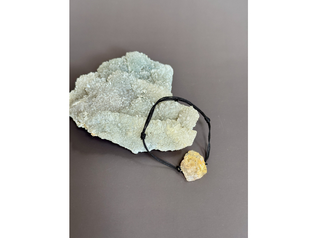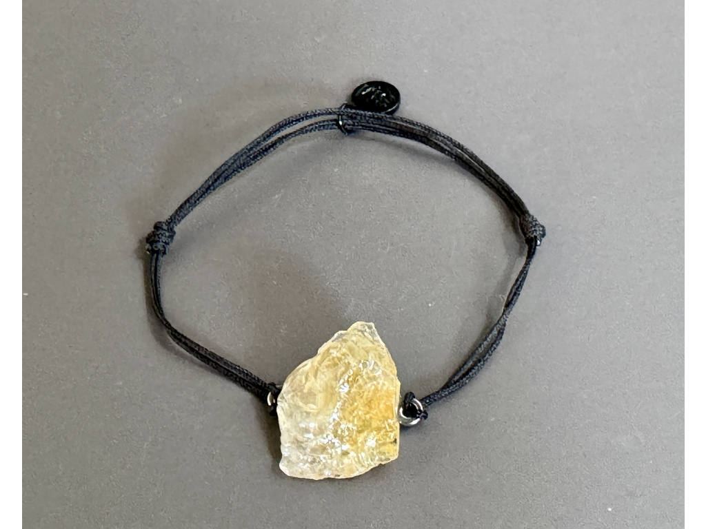 Minimalistický náramek s jedním neopracovaným kouskem citrínu na černé šňůrce. Surová textura a teplý medově zlatý odstín kamene dodají ruce přirozený akcent, který se hodí ke všemu.