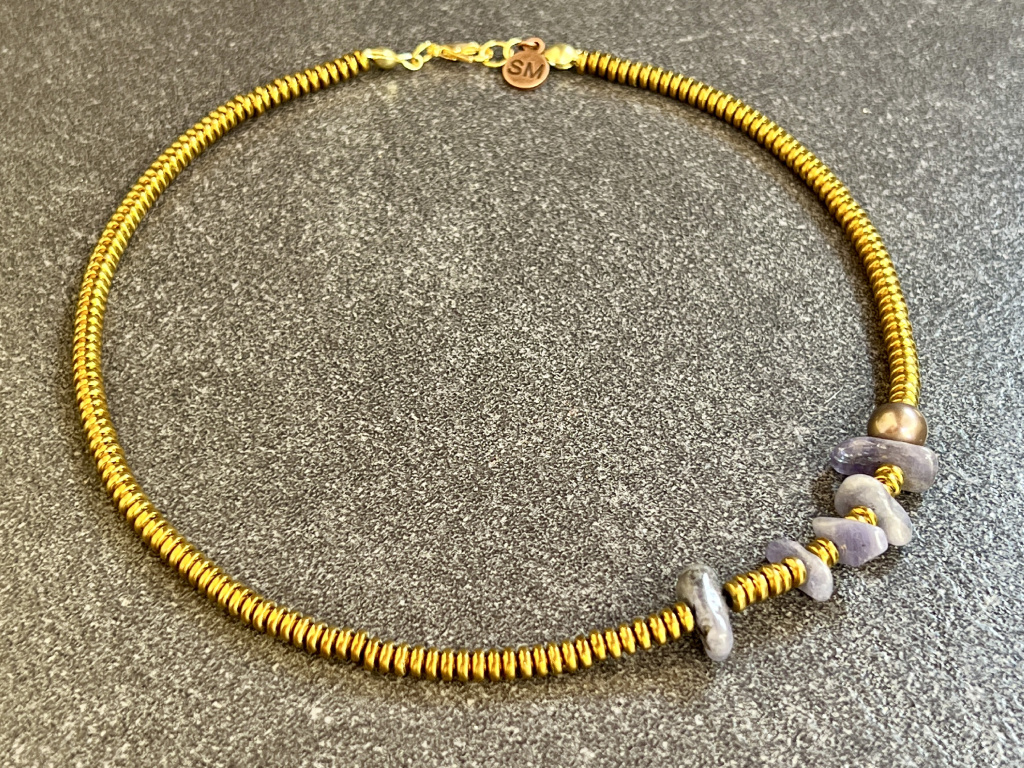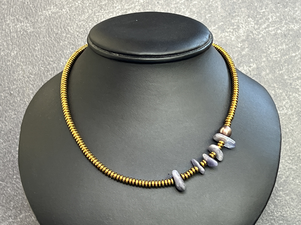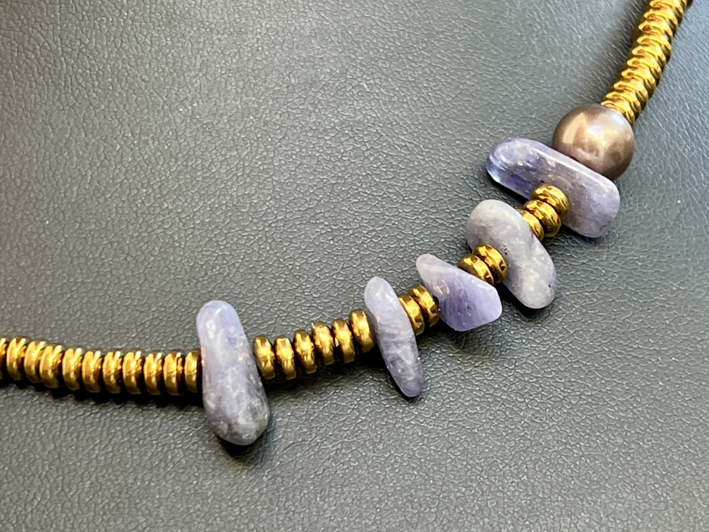 NÁHRDELNÍK Z HEMATITU, TANZANITU A ČERNÉ PERLY (rekonstruovaná)