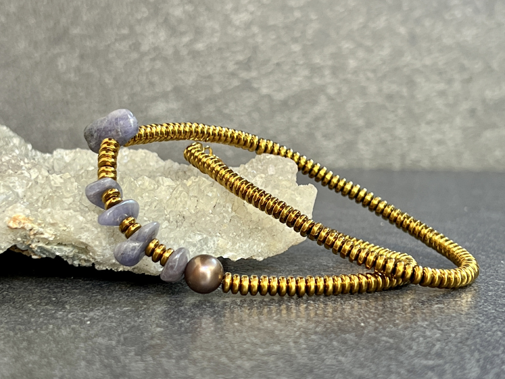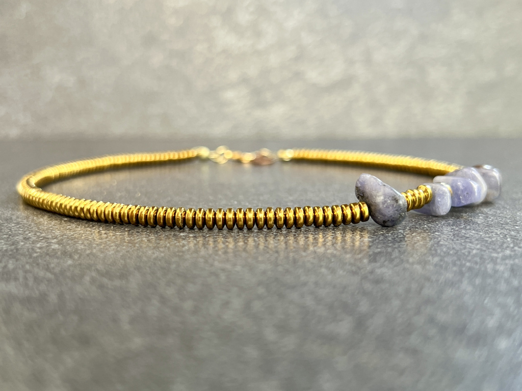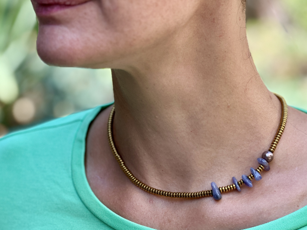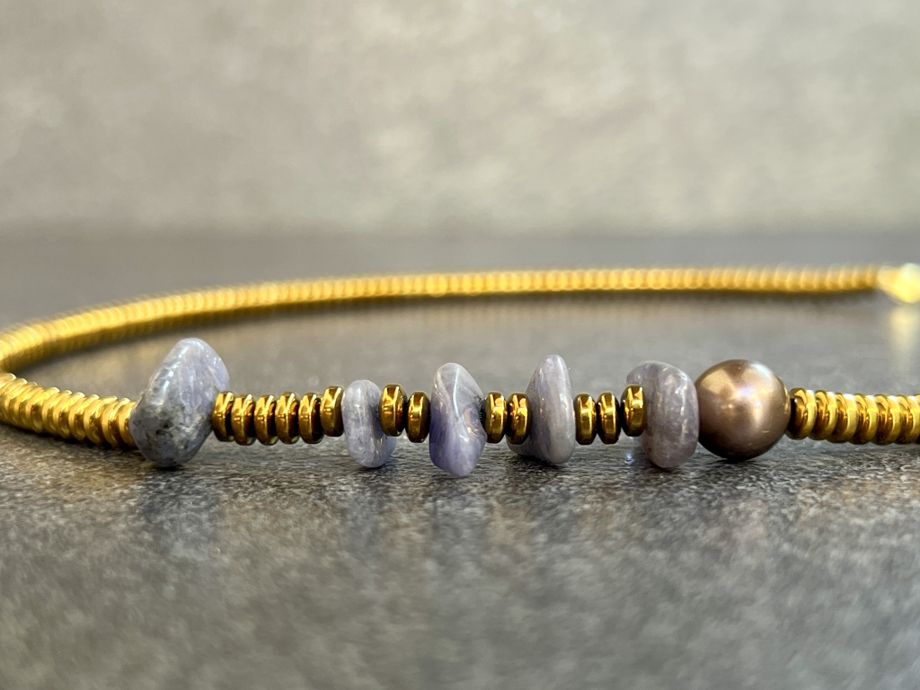 Objevte kouzlo rovnováhy a vnitřní síly s náhrdelníkem z hematitu, tanzanitu a rekonstruované černé perly