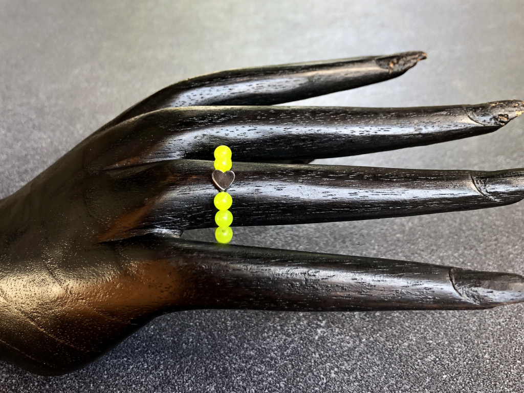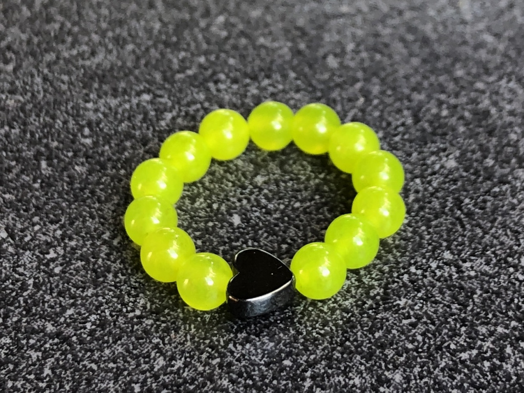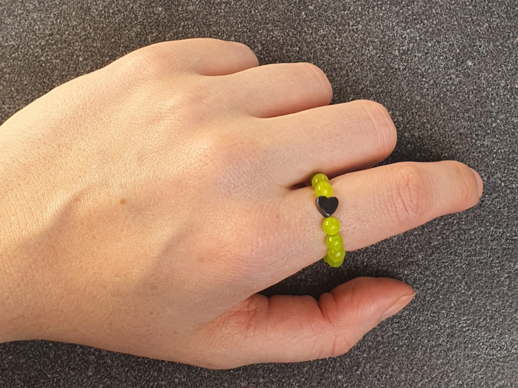 Prstýnek z jadeitu s hematitovým srdíčkem vnáší do života harmonii. Je symbolem klidu a míru. Přitahuje štěstí a přátelství.