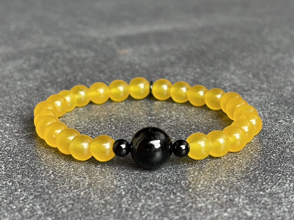 Žlutý barvený náramek z kamene jadeit, je symbolem klidu a míru. Jedná se o ochranný kámen, jenž vnáší do života harmonii.