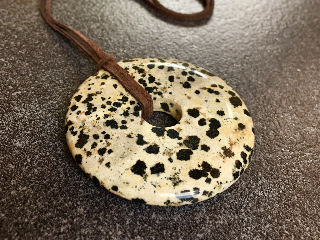 Přívěsek z vrtaného jaspisu dalmatin, přináší svému majiteli útěchu v náročné době.