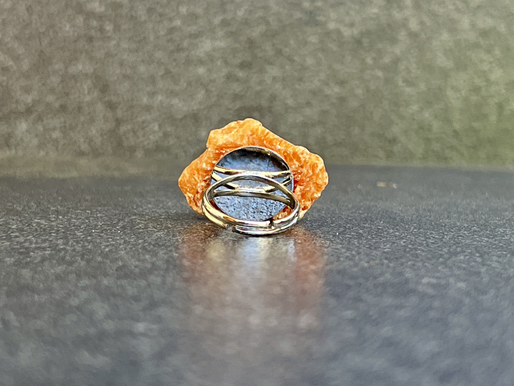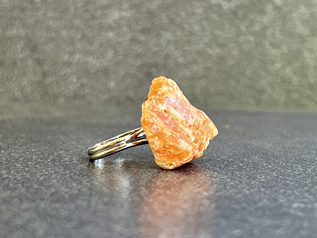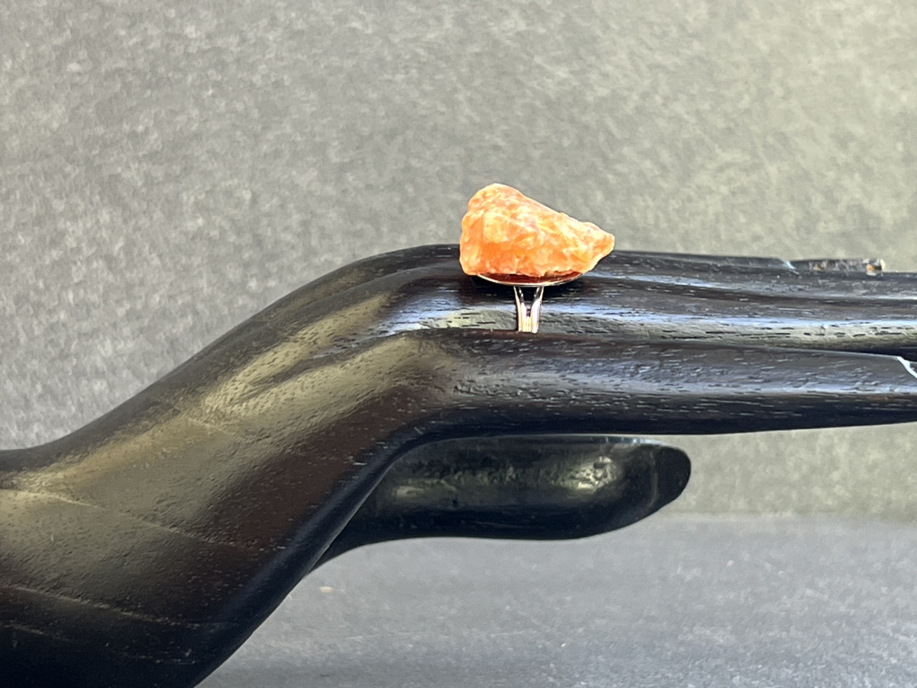 Jemně výrazný prsten s autentickým kouskem kalcitu v odstínech broskvově růžové až meruňkové – připomíná okvětní lístky orchideje. Neleštěná, krystalická textura zachytává světlo do sametového lesku a každý kus je jedinečný originál.
