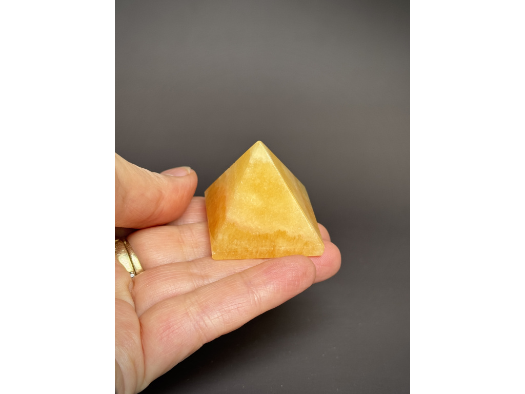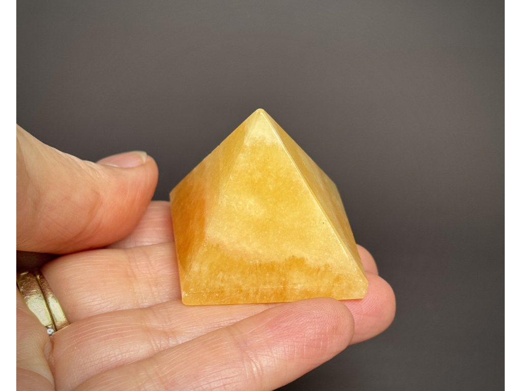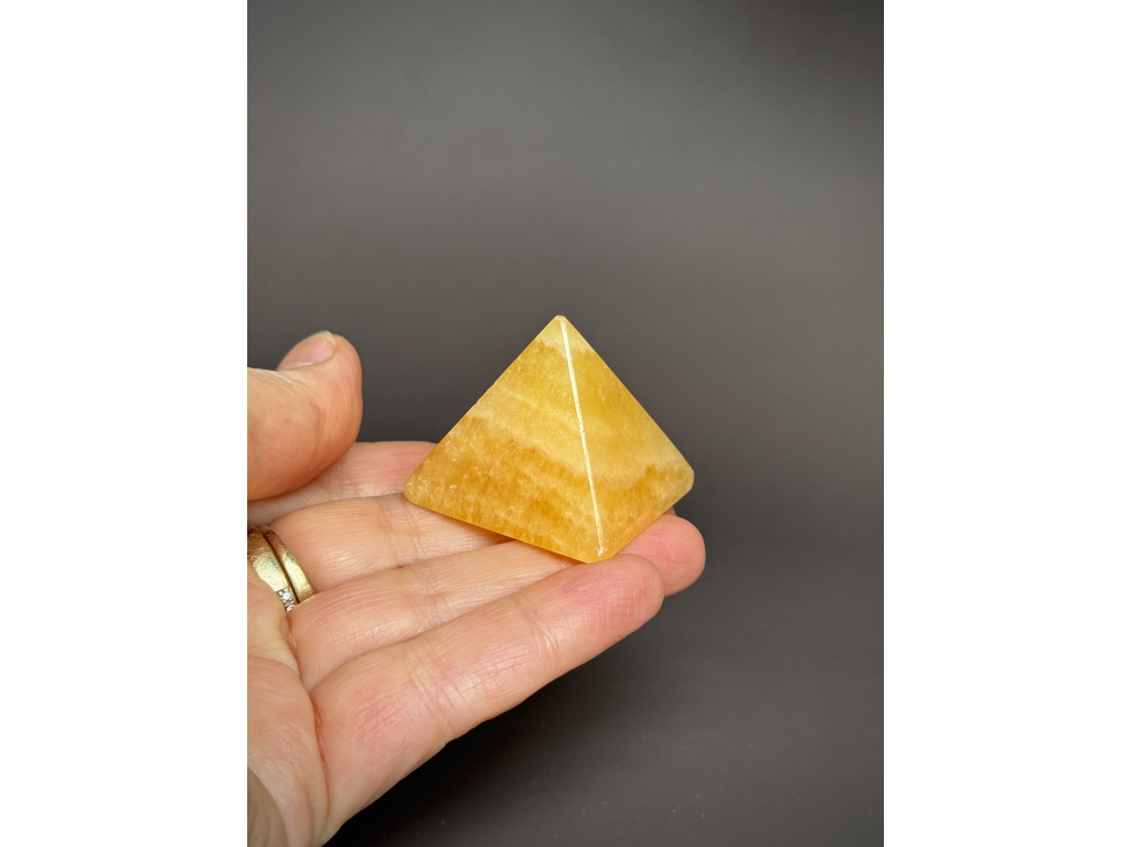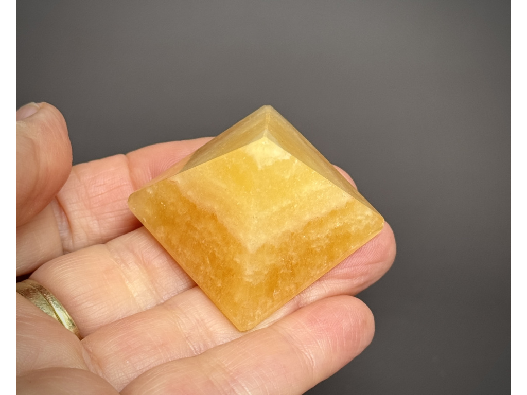 - Přírodní medový kalcit, pečlivě broušený a leštěný do přesné pyramidy.