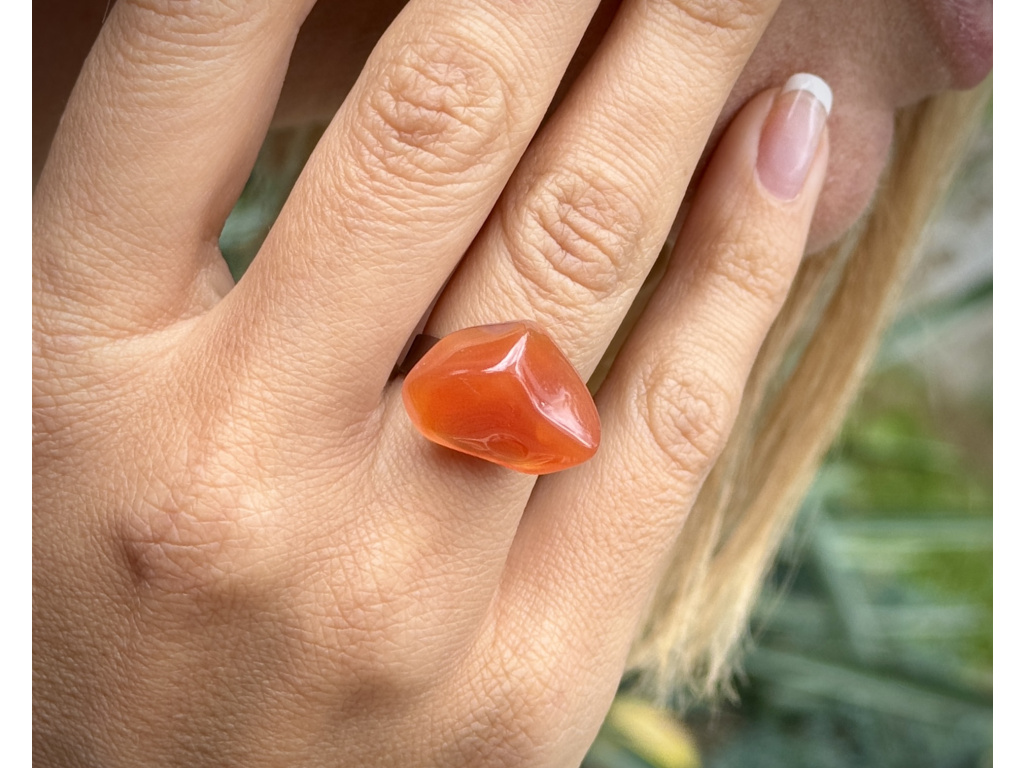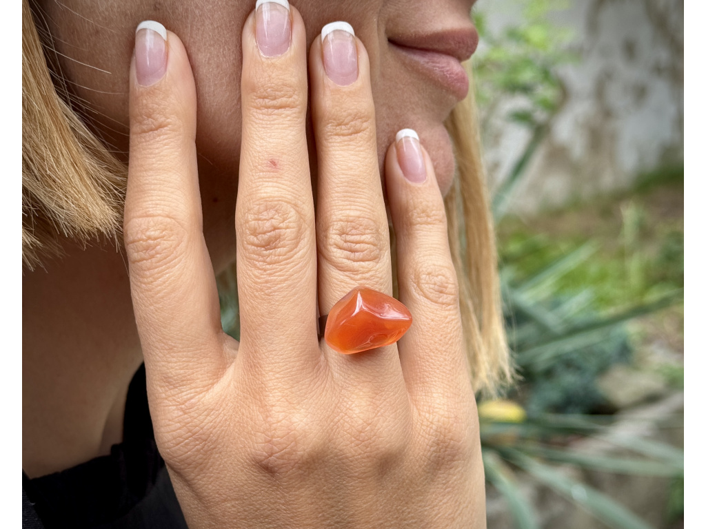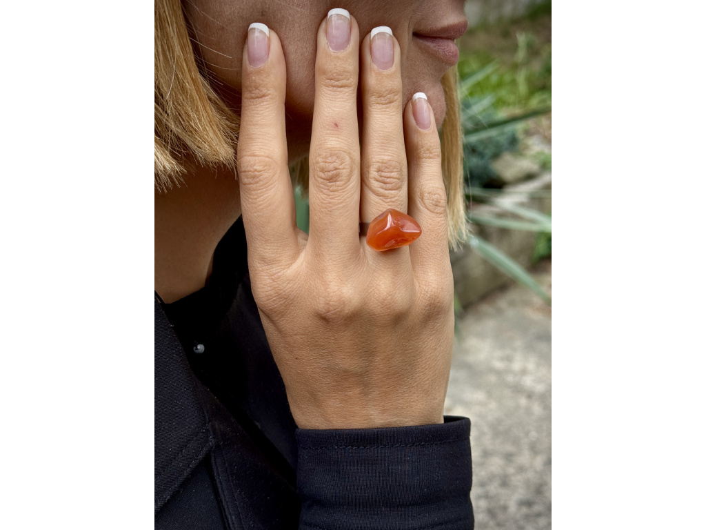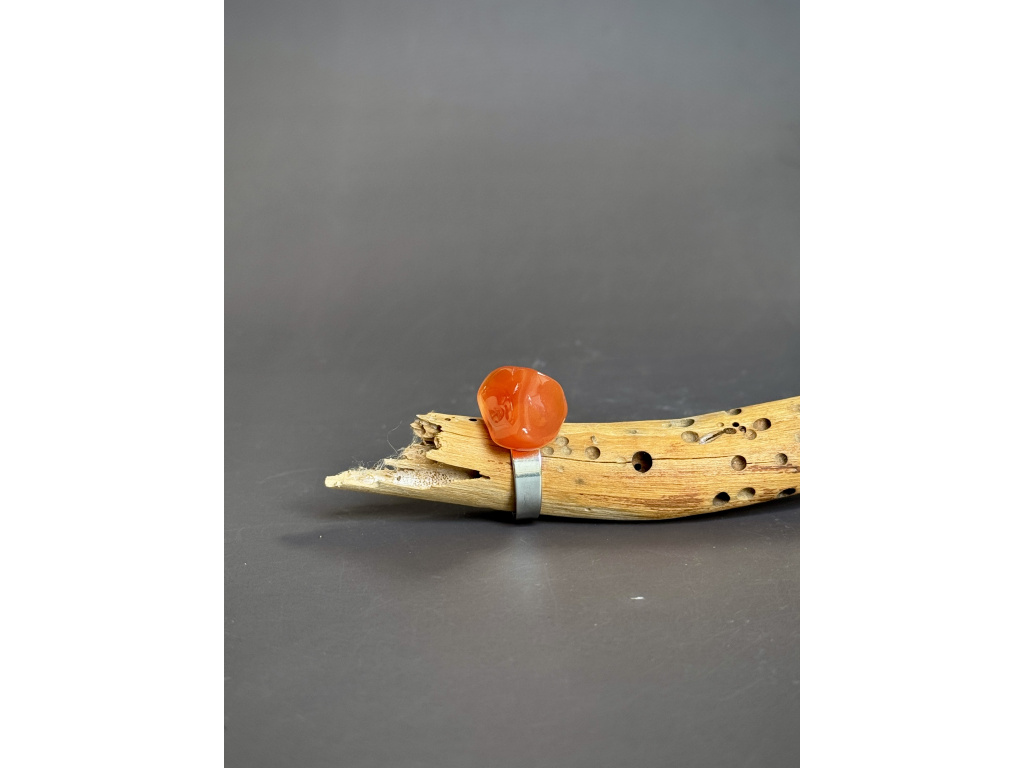 Elegantní prsten s hladce tromlovaným karneolem v sytě oranžovo‑červených tónech. Lesklý povrch a příjemně oblý tvar působí hřejivě a dodá rukám živý akcent.
