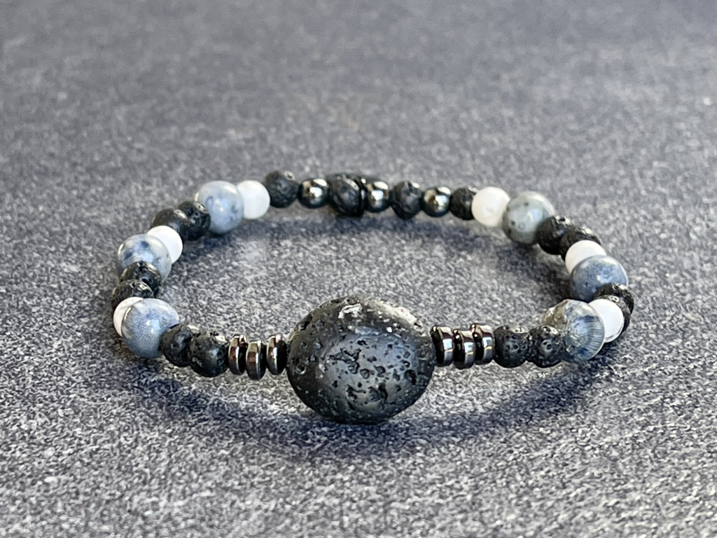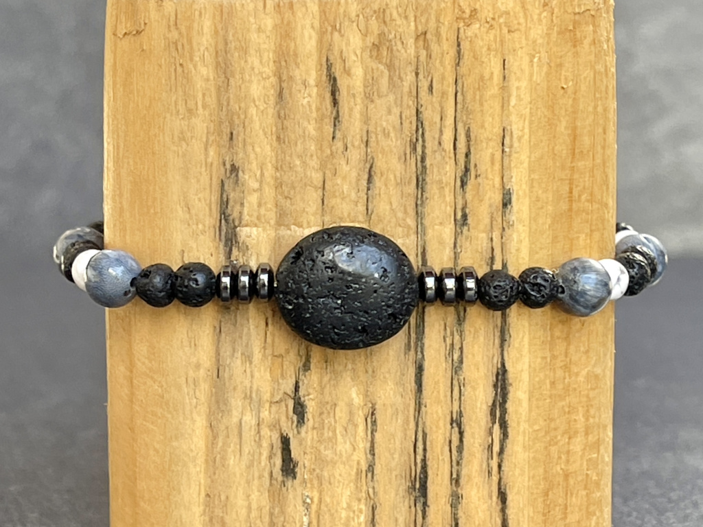 Náramek se skládá z mixu korálu modrého, magnezitu, lávy a hematitu. Modrá barva korálu povzbuzuje pozitivní myšlení, potlačuje deprese a zklidňuje rozbouřenou mysl. Magnezit, kámen štěstí, se snaží přinést do vašeho života radost a štěstí. Láva, známá svou silnou životní energií, současně uklidňuje a dodává pocit klidu. Ochranný kámen hematit zabraňuje negativním energiím vstoupit do aury, chrání vás a udržuje vás v bezpečí.