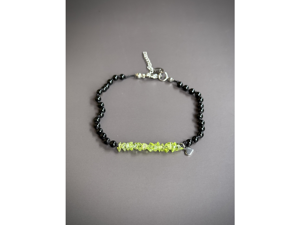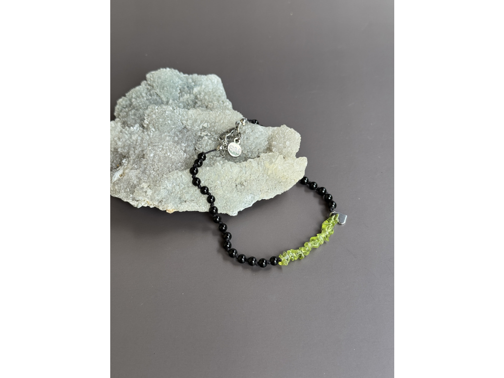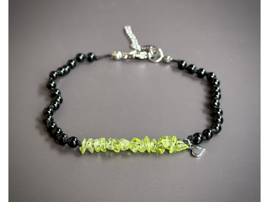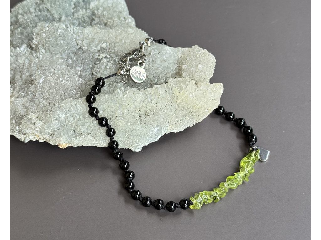 Ručně vázaný anklet z černého achátu a olivínu Vám dodá citovou a tělesnou rovnováhu. Podporuje sebedůvěru, dodá odvahu a celkově posiluje imunitu. Olivín je kamenem vitality.