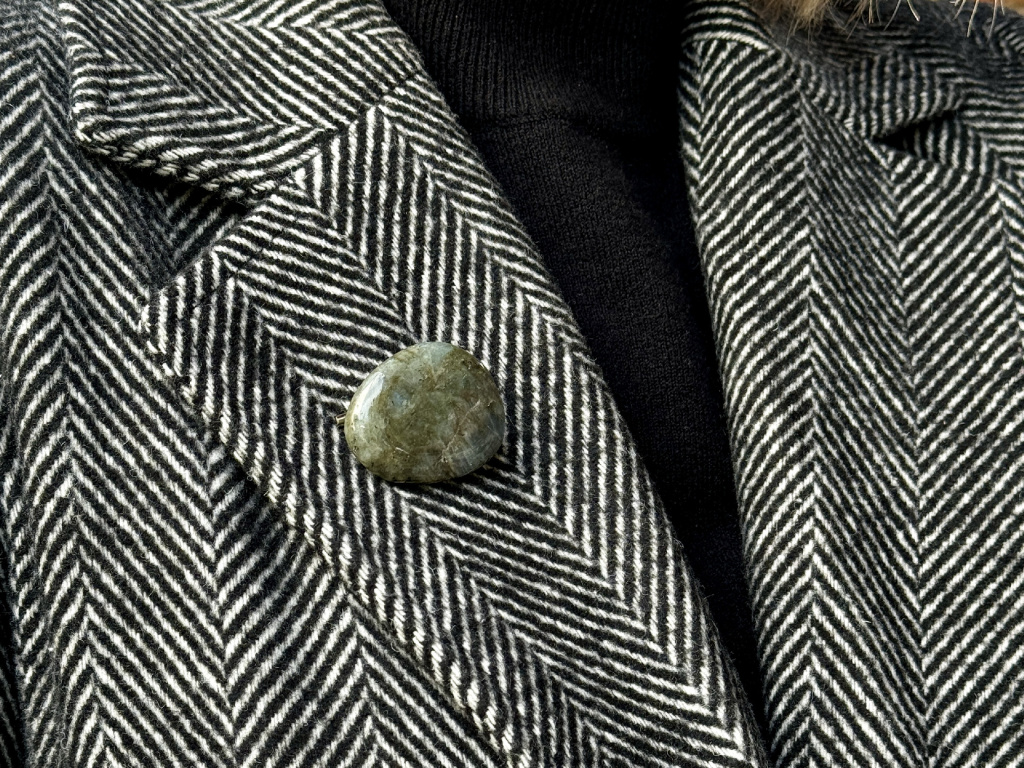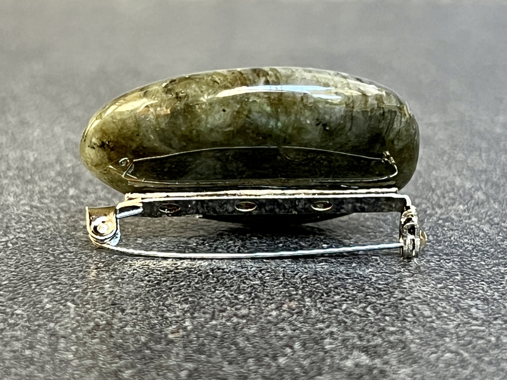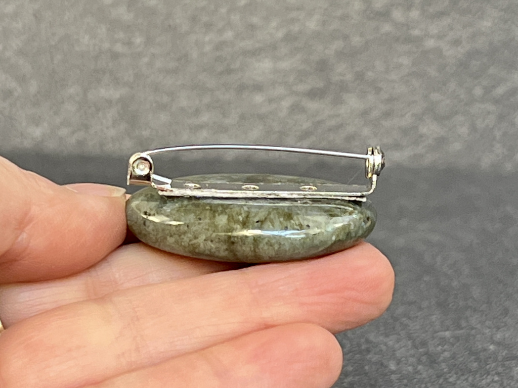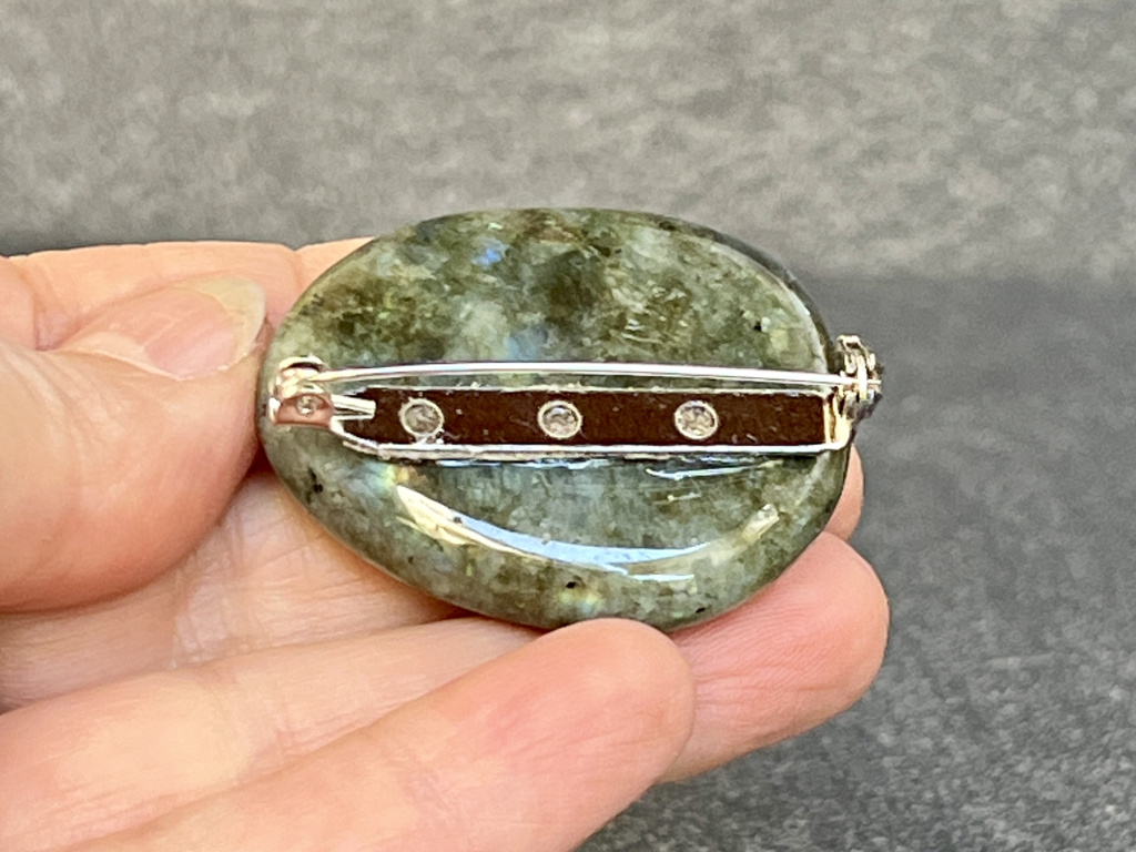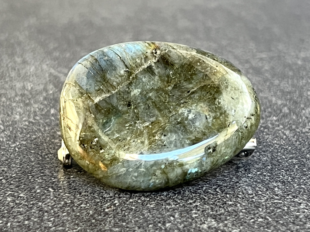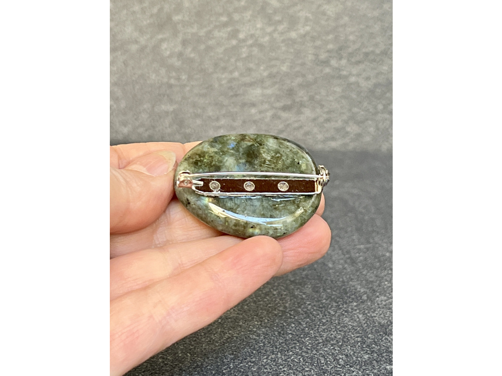 Brož z labradoritu ve tvaru placičky - labradorit je kamenem intuice, meditace a aury. Pomáhá vyvolat vzpomínky, které dávno zapadly kamsi hluboko do paměti. Těží se na poloostrově Labrador.