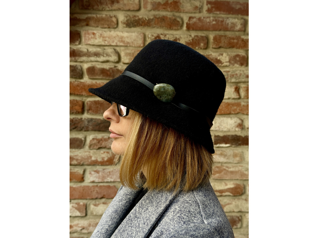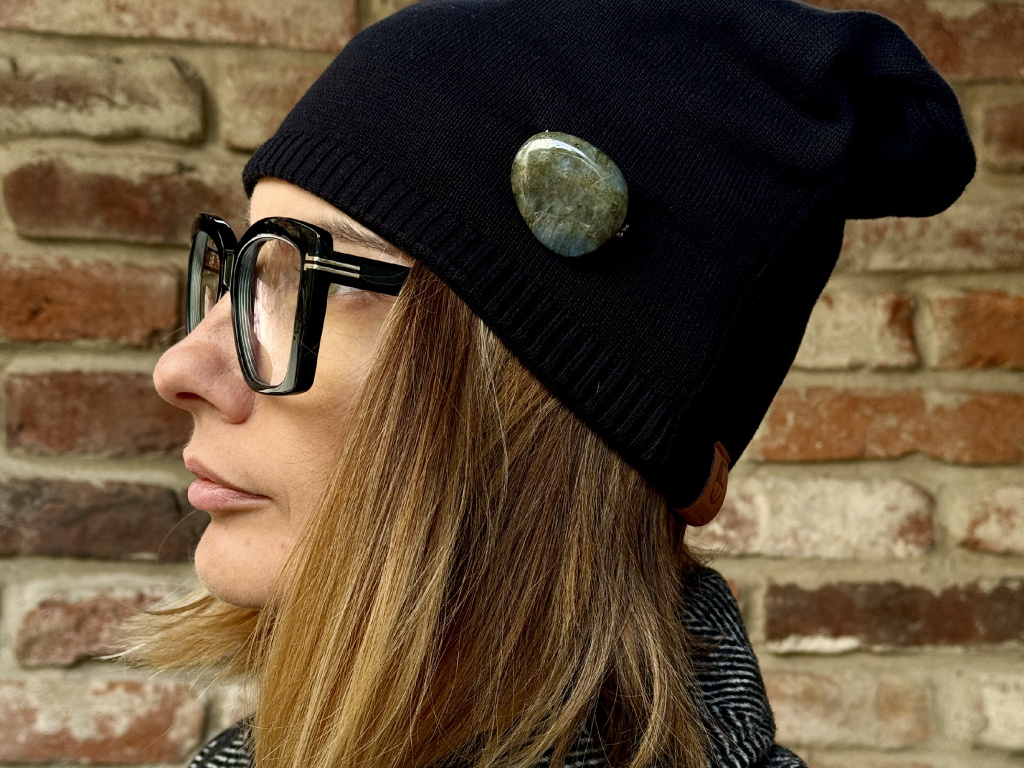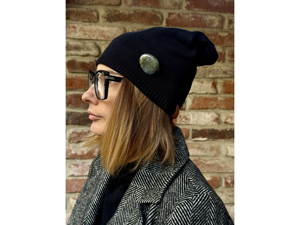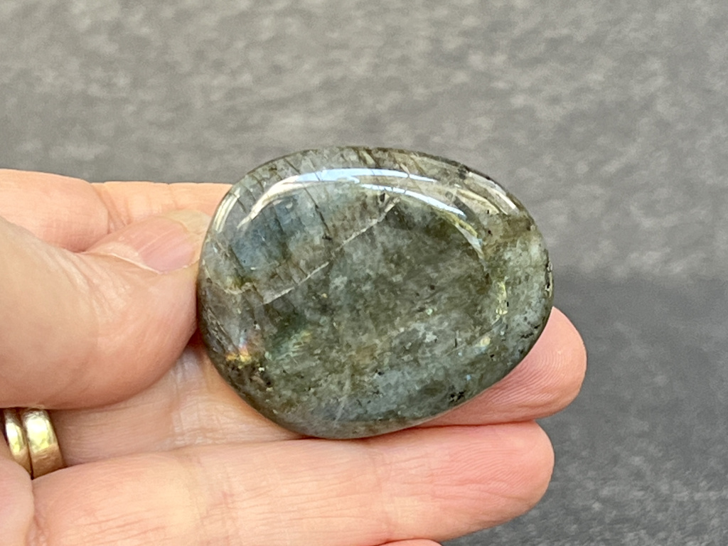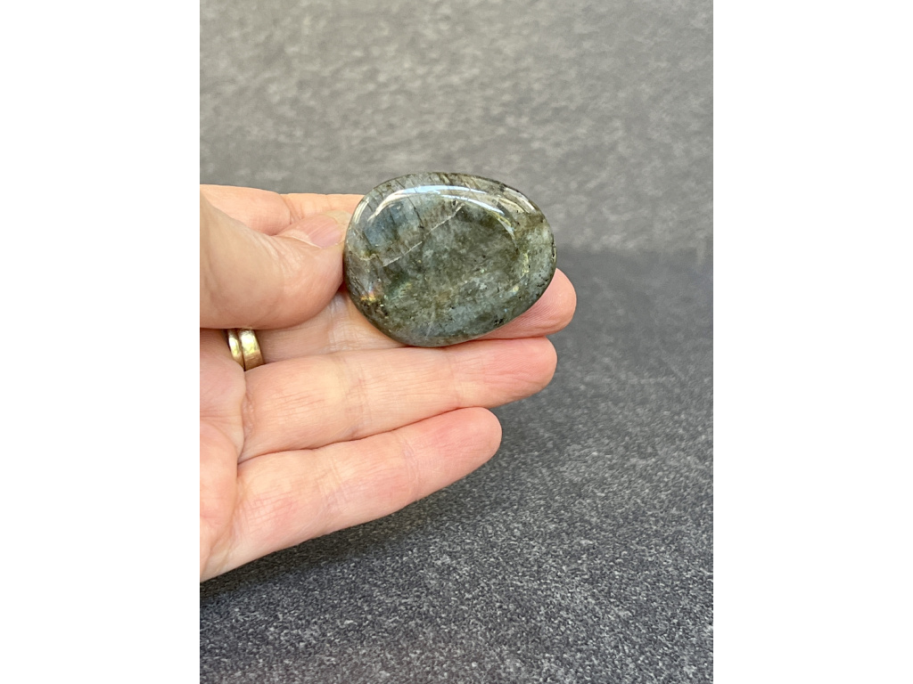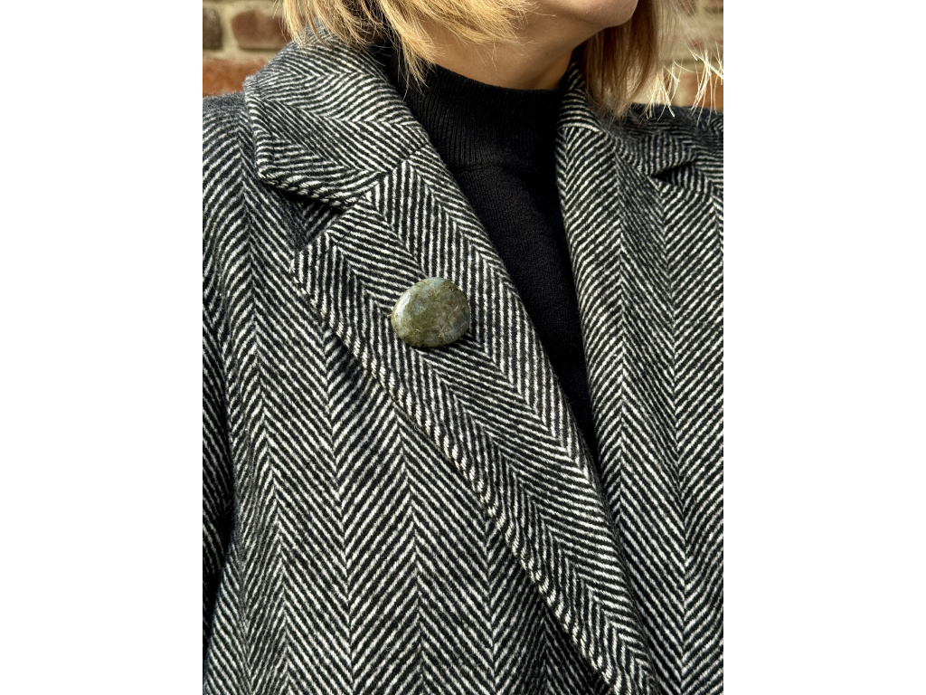 Brož z labradoritu ve tvaru placičky - labradorit je kamenem intuice, meditace a aury. Pomáhá vyvolat vzpomínky, které dávno zapadly kamsi hluboko do paměti. Těží se na poloostrově Labrador.