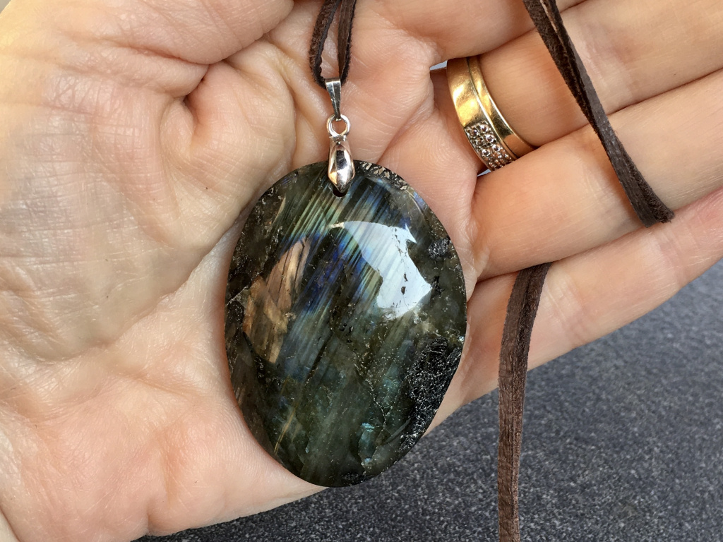 Přívěsek na krk z labradoritu je kamenem intuice, meditace a aury. Pomáhá vyvolat vzpomínky, které dávno zapadly kamsi hluboko do paměti.
