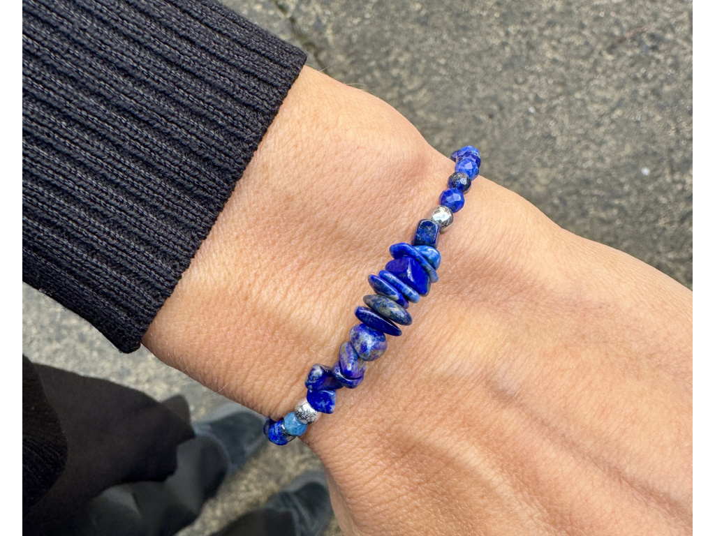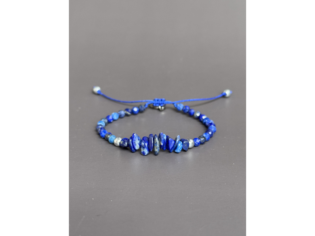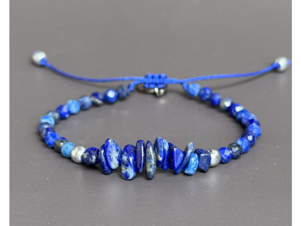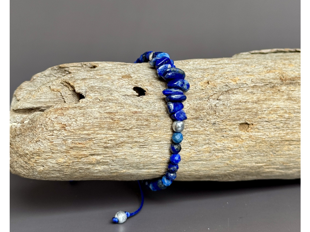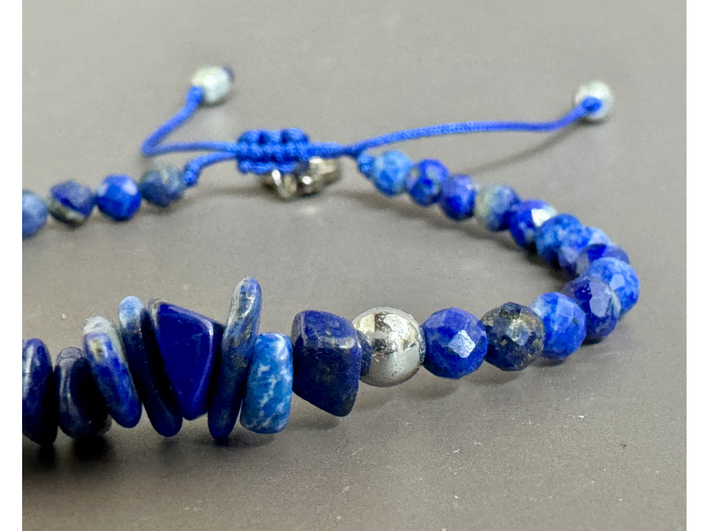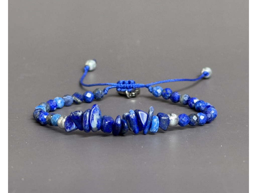 Ručně vázaný náramek z kvalitního fasetovaného lapisu lazuli a hematitu přináší harmonii, podporuje odhodlání a chrání před negativními vlivy.