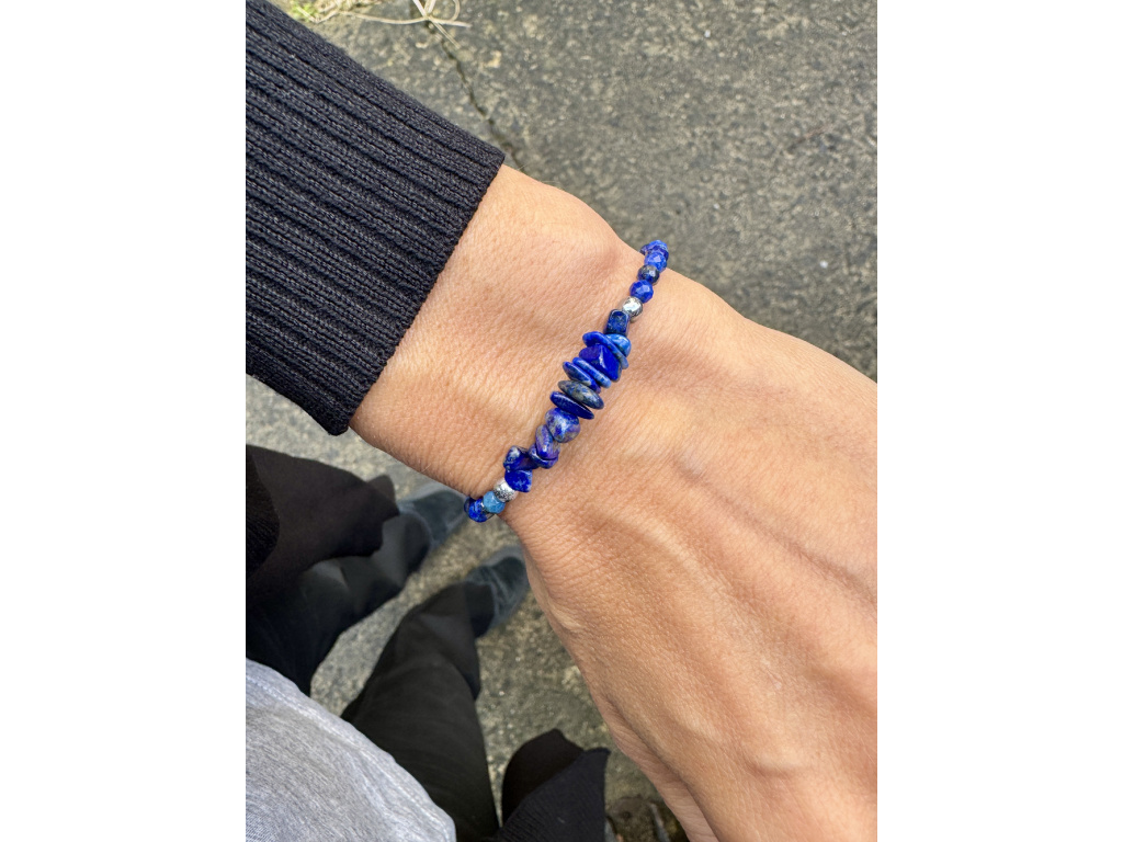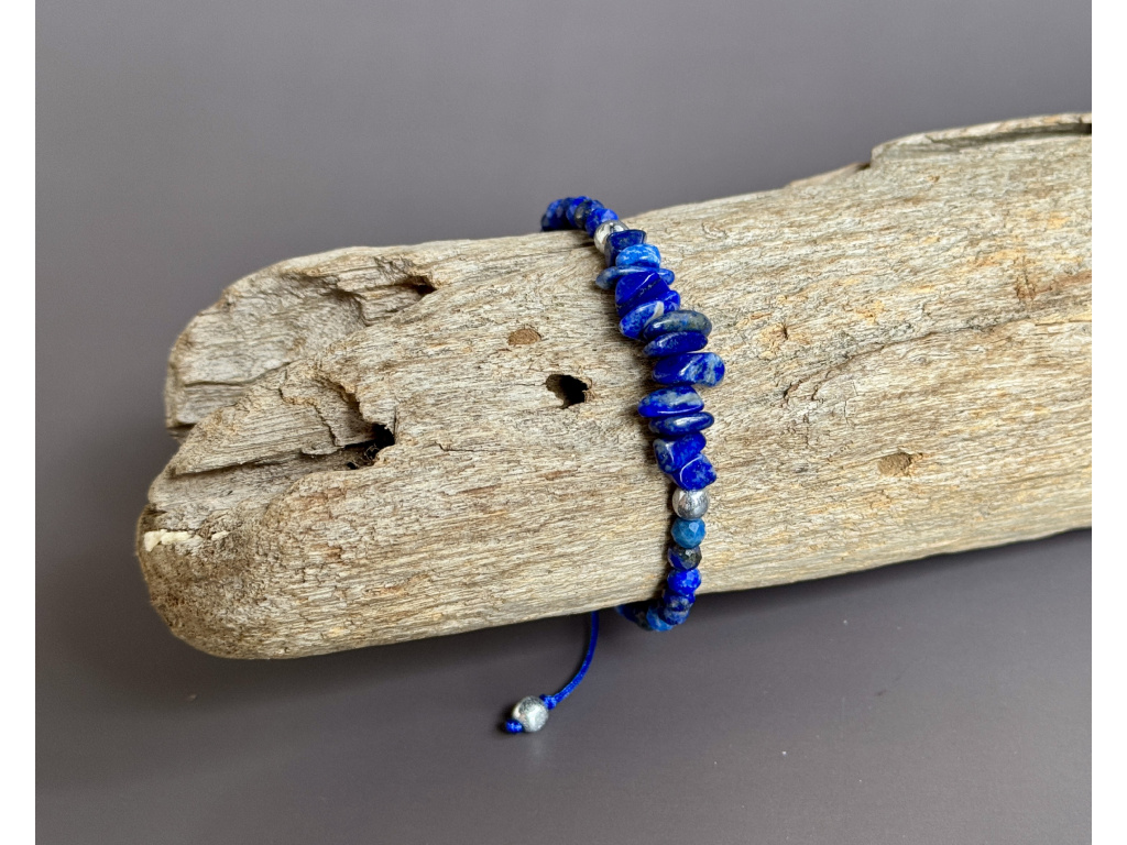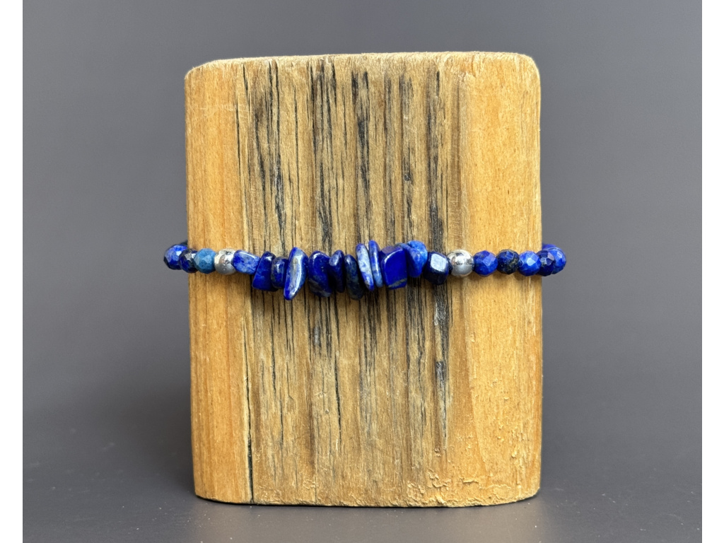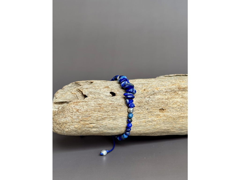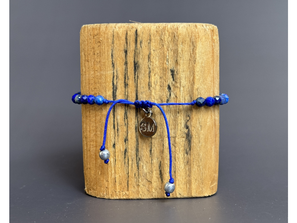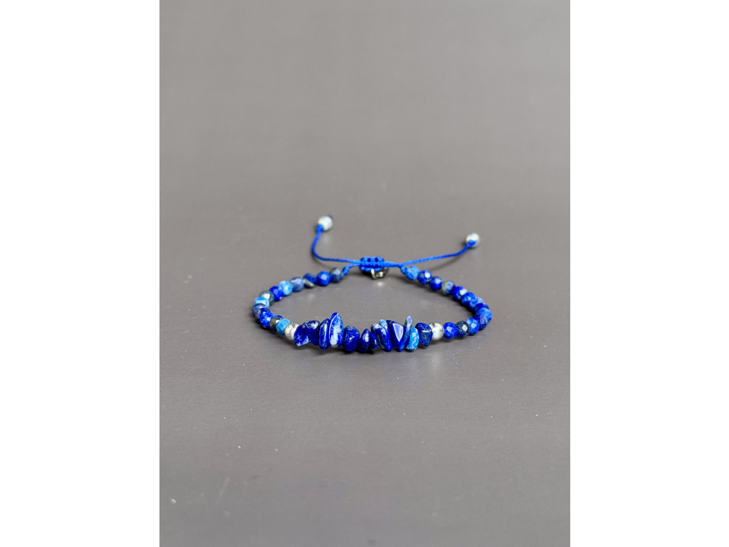 Ručně vázaný náramek z kvalitního fasetovaného lapisu lazuli a hematitu přináší harmonii, podporuje odhodlání a chrání před negativními vlivy.