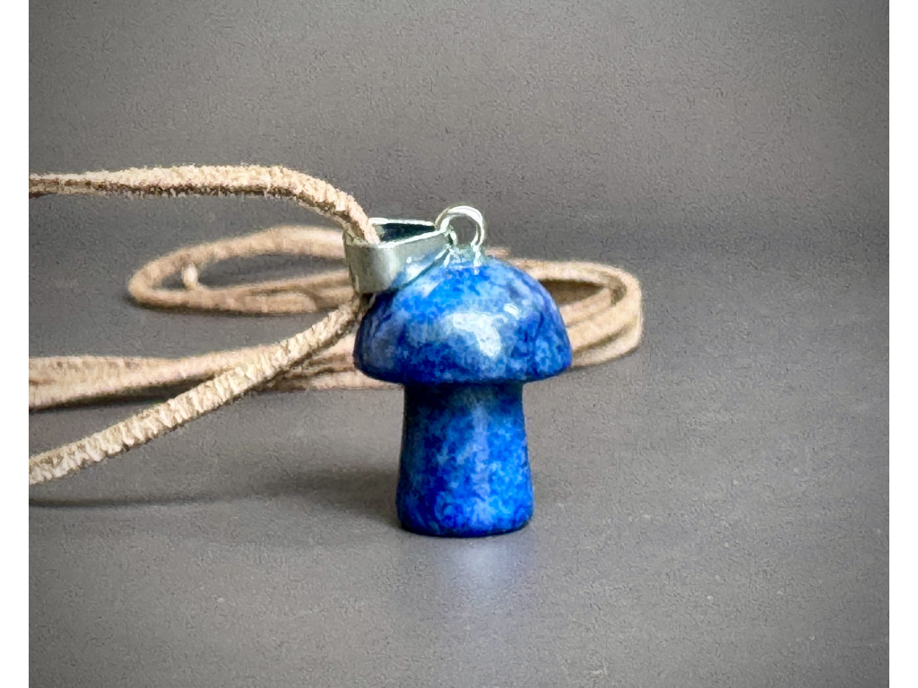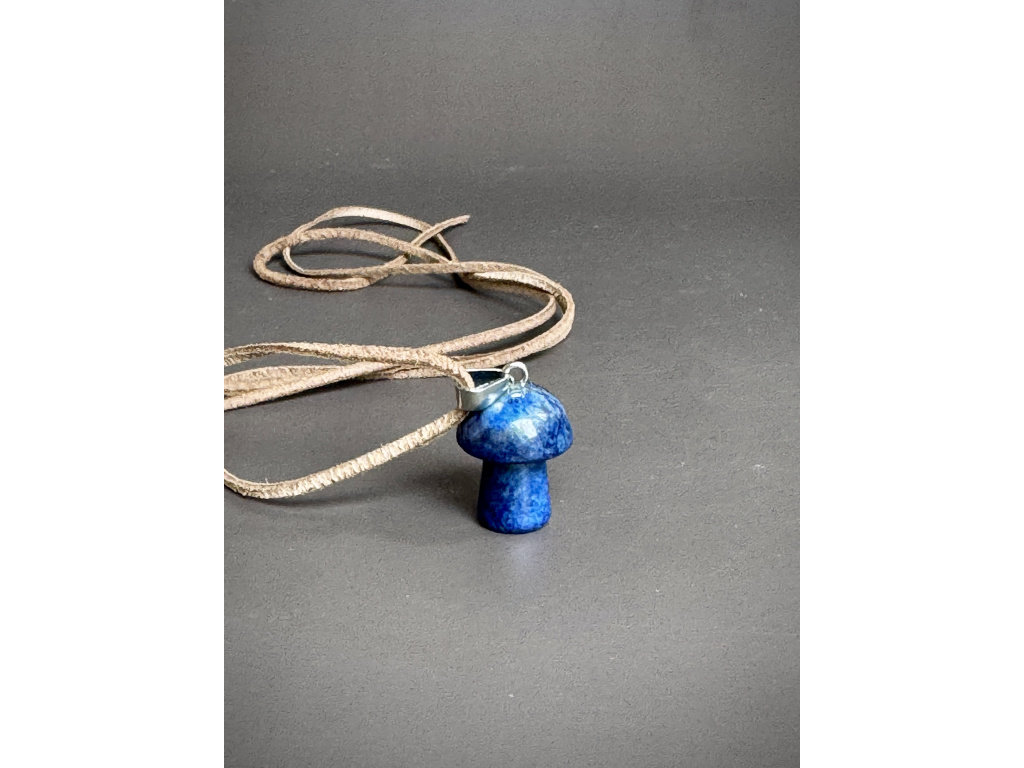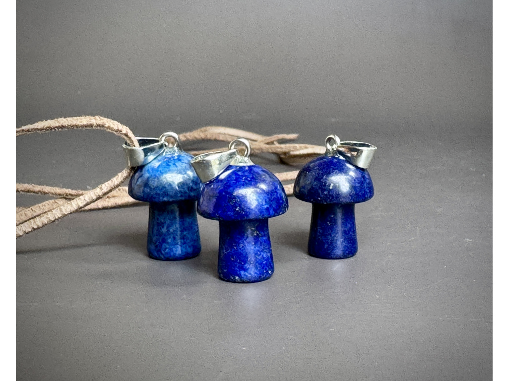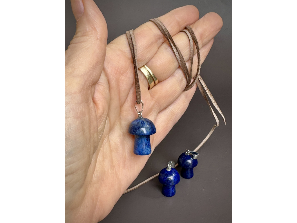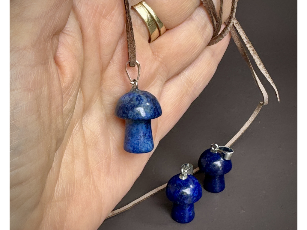 Originální přívěsek z přírodního lapisu lazuli v hravém tvaru houby. Sytě modrý kámen se zlatavými záblesky pyritu připomíná noční oblohu plnou hvězd. Jemně spojuje moudrost a klid mysli s ochranou a intuicí – ideální pro každého, kdo se chce ladit na hlubší vnímání sebe i světa.