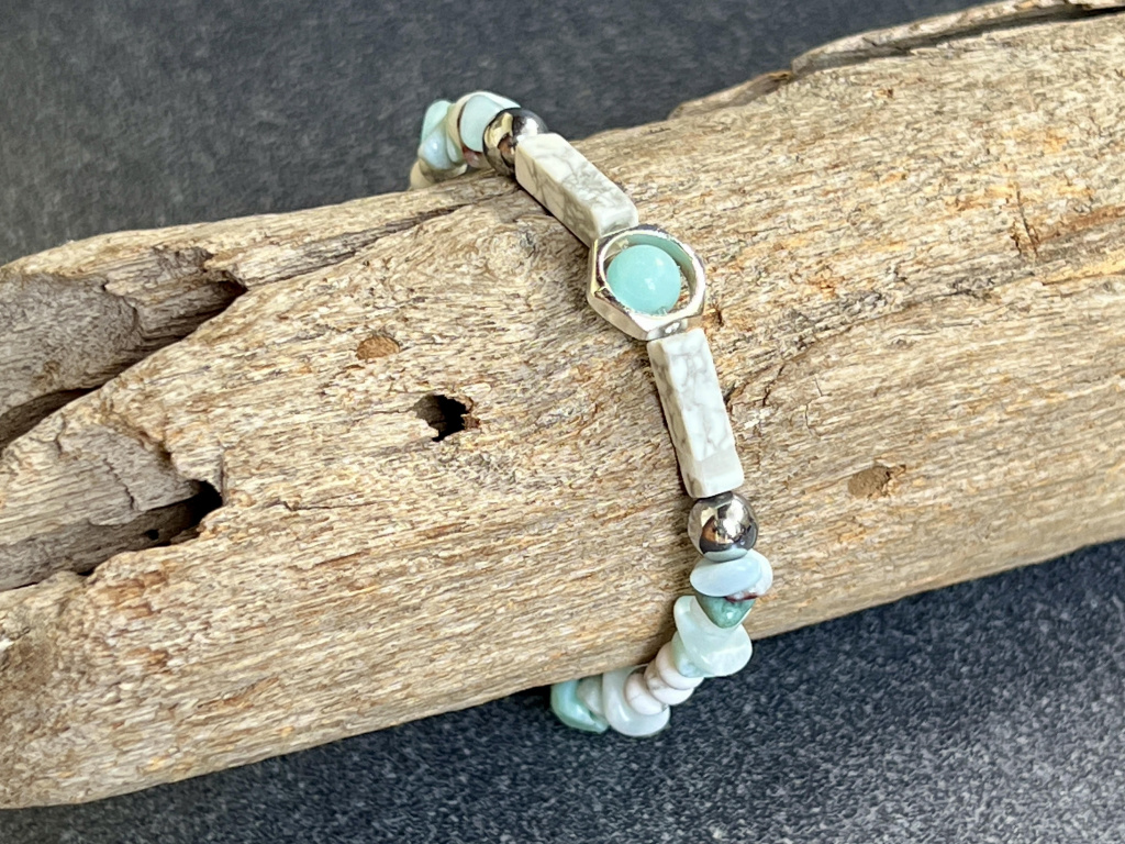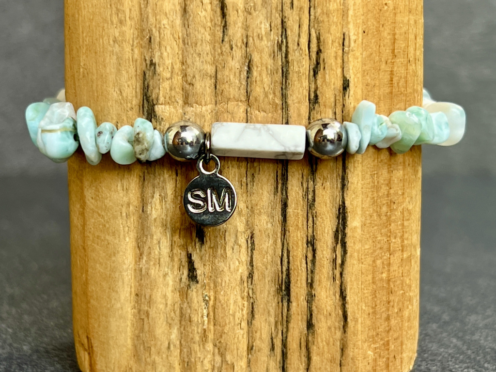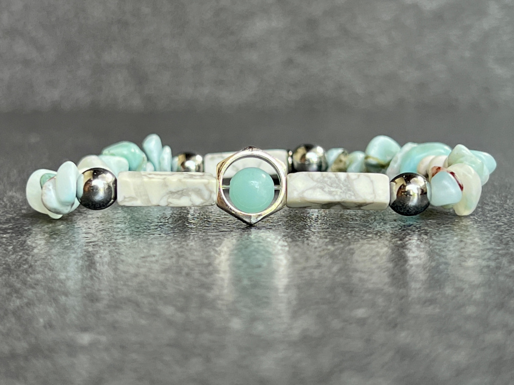 Ručně vyrobený náramek z larimaru a magnezitu dodává citovou a rozumovou rovnováhu, ochraňuje a dokáže významně pomoci s problematickým vztahem.