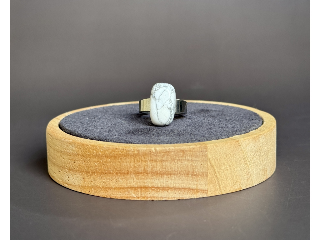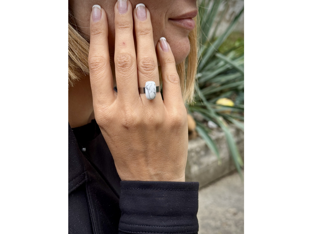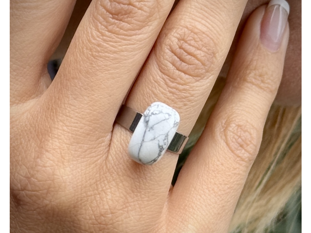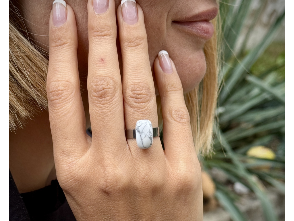 Elegantní prsten s přírodním kamenem magnezitu v minimalistickém provedení. Bílý kámen s jemnými šedými žilkami dodává šperku nadčasovou čistotu a snadno se kombinuje s jakýmkoli outfitem.