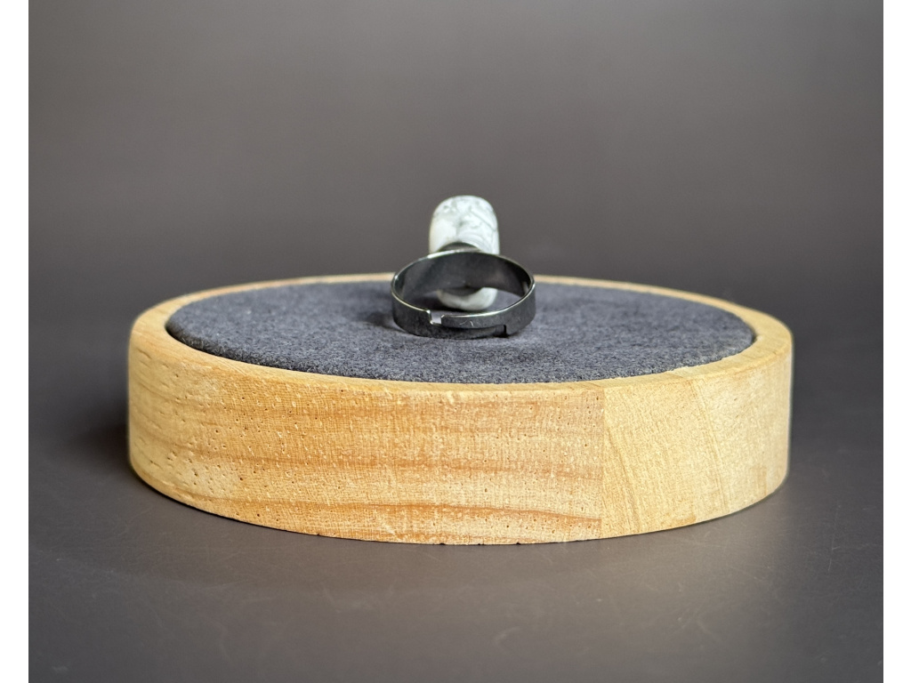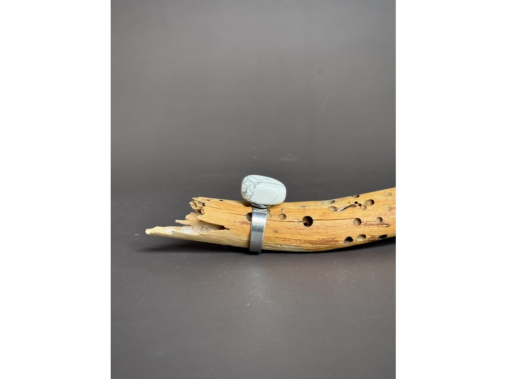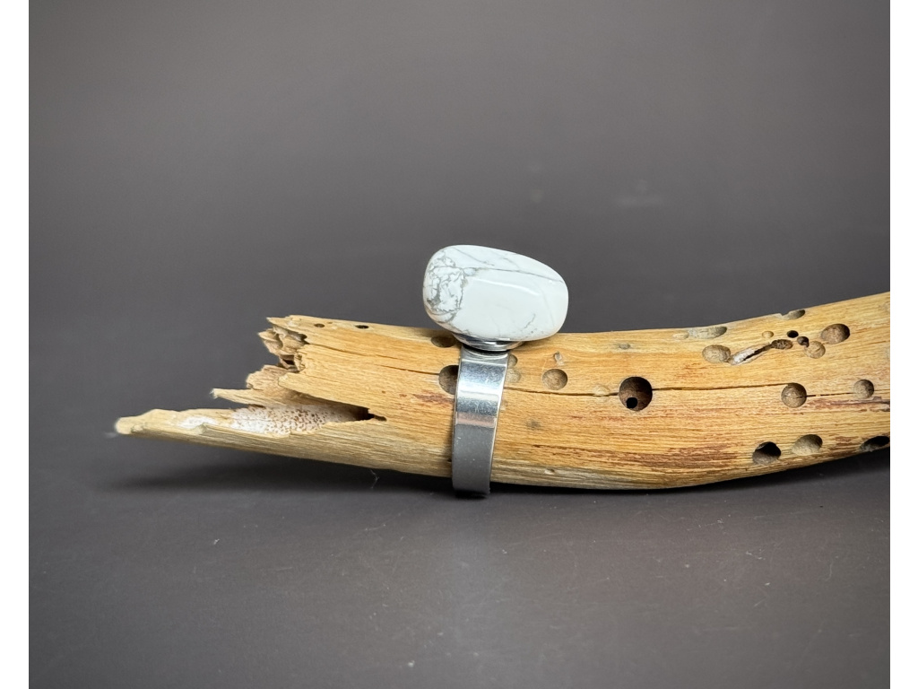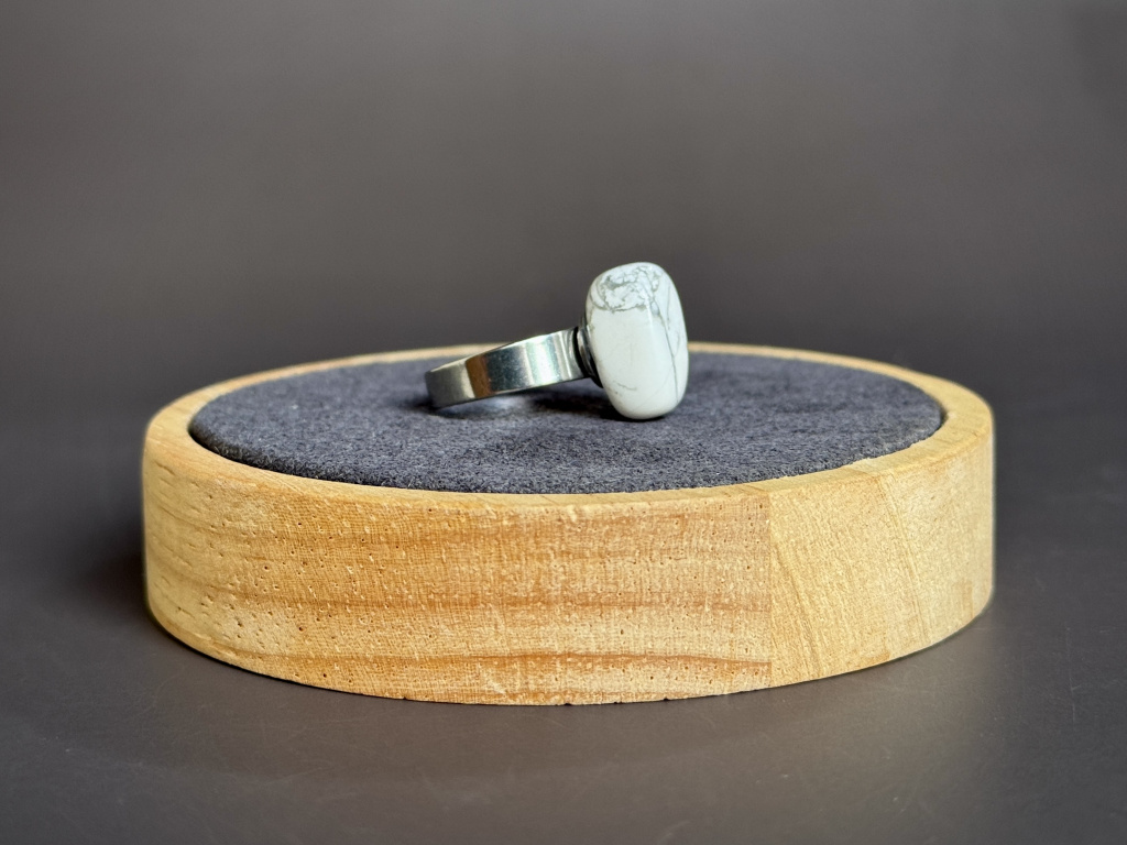 Elegantní prsten s přírodním kamenem magnezitu v minimalistickém provedení. Bílý kámen s jemnými šedými žilkami dodává šperku nadčasovou čistotu a snadno se kombinuje s jakýmkoli outfitem.