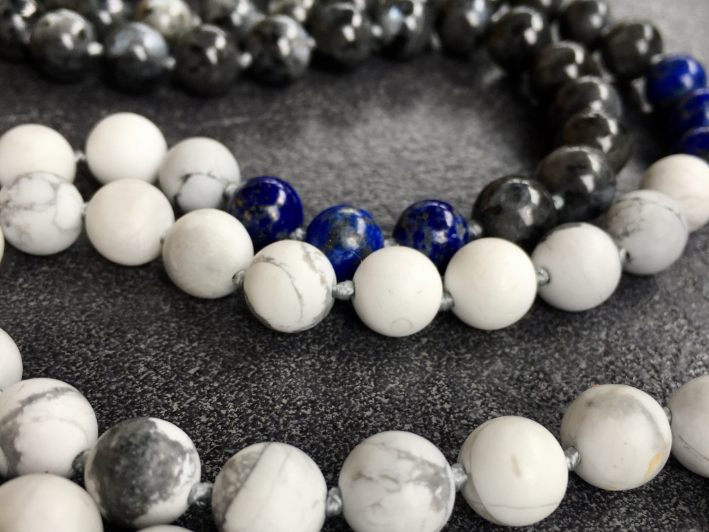 Nádherný náhrdelník sestavený z magnezitu, labradoritu černého a lapisu lazuli, dokáže pomoci s problematickými vztahy a posílit citovou rovnováhu. Náhrdelníky Mála jsou řetězce kuliček, které jsou nejčastěji v počtu 108, ale vždy dělitelné 9, aby bylo zachováno duchovno, které je spojeno s budhismem.