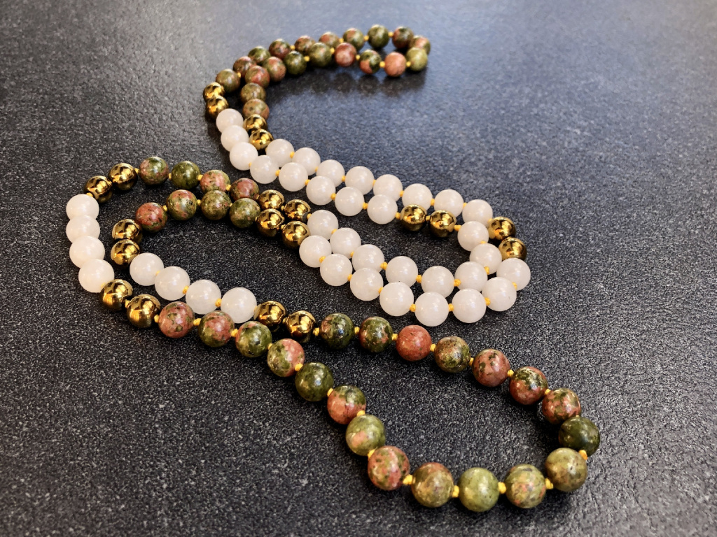 Náhrdelník sestavený z unakitu, růženínu a hematitu zlaceného. Náhrdelníky Mála jsou řetězce kuliček, které jsou nejčastěji v počtu 108, ale vždy dělitelné 9, aby bylo zachováno duchovno, které je spojeno s budhismem.
