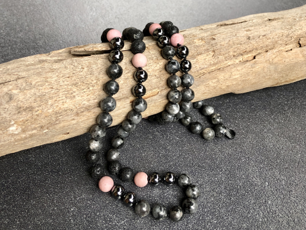 Nádherný náhrdelník sestavený z lávy, labradoritu černého, hematitu a jaspisu růžového dokáže pomoci s problematickými vztahy a posílit citovou rovnováhu. Náhrdelníky Mála jsou řetězce kuliček, které jsou nejčastěji v počtu 108, ale vždy dělitelné 9, aby bylo zachováno duchovno, které je spojeno s budhismem.