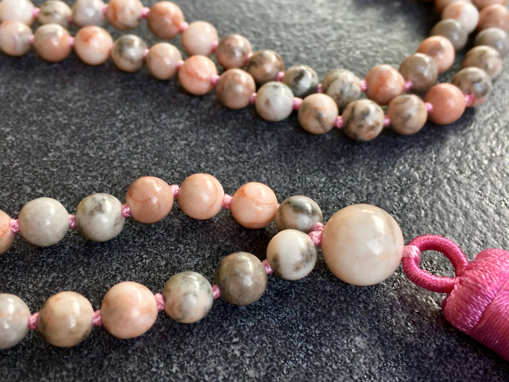 Nádherný náhrdelník sestavený z růžového jaspisu zebra, dokáže pomoci posílit citovou a tělesnou rovnováhu. Náhrdelníky Mála jsou řetězce kuliček, které jsou nejčastěji v počtu 108, ale vždy dělitelné 9, aby bylo zachováno duchovno, které je spojeno s budhismem.