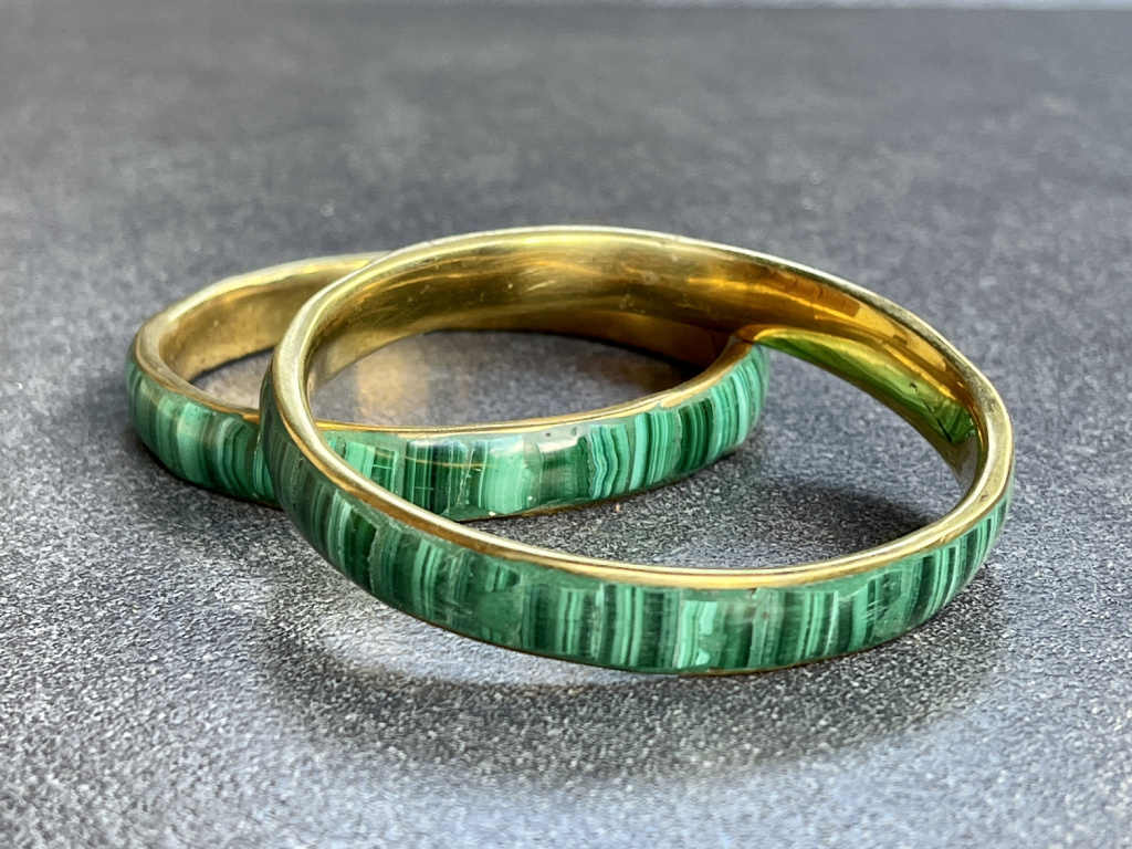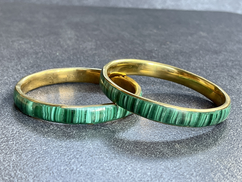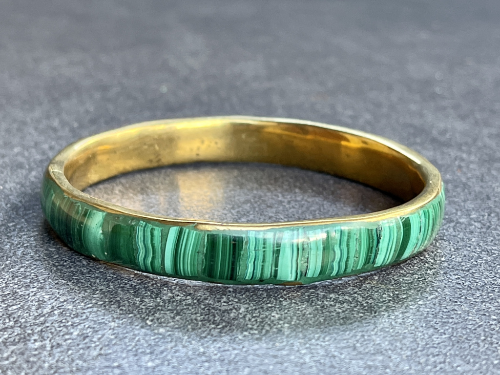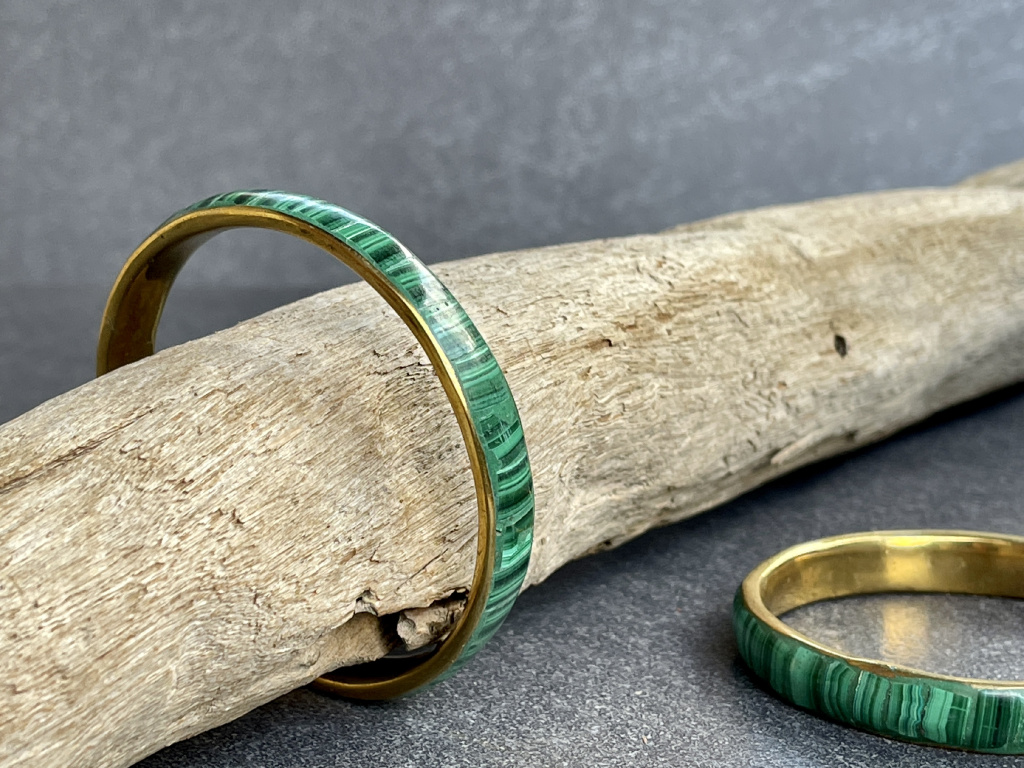 Stylový náramek s povrchem z pravého malachitu vyniká nádhernými zelenými pruhy a elegantní zlatou obroučkou. Každý kus je originál díky jedinečné kresbě přírodního kamene, která nese nezaměnitelný charakter malachitu.