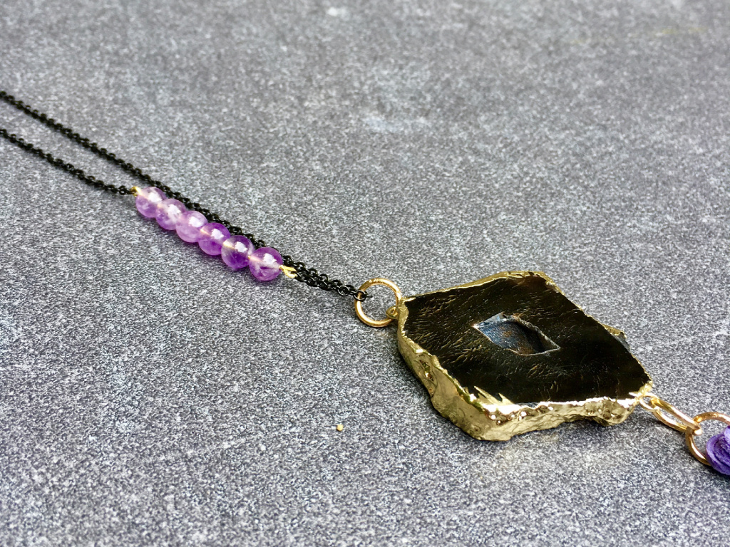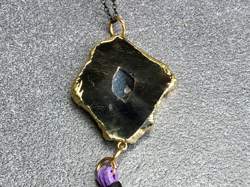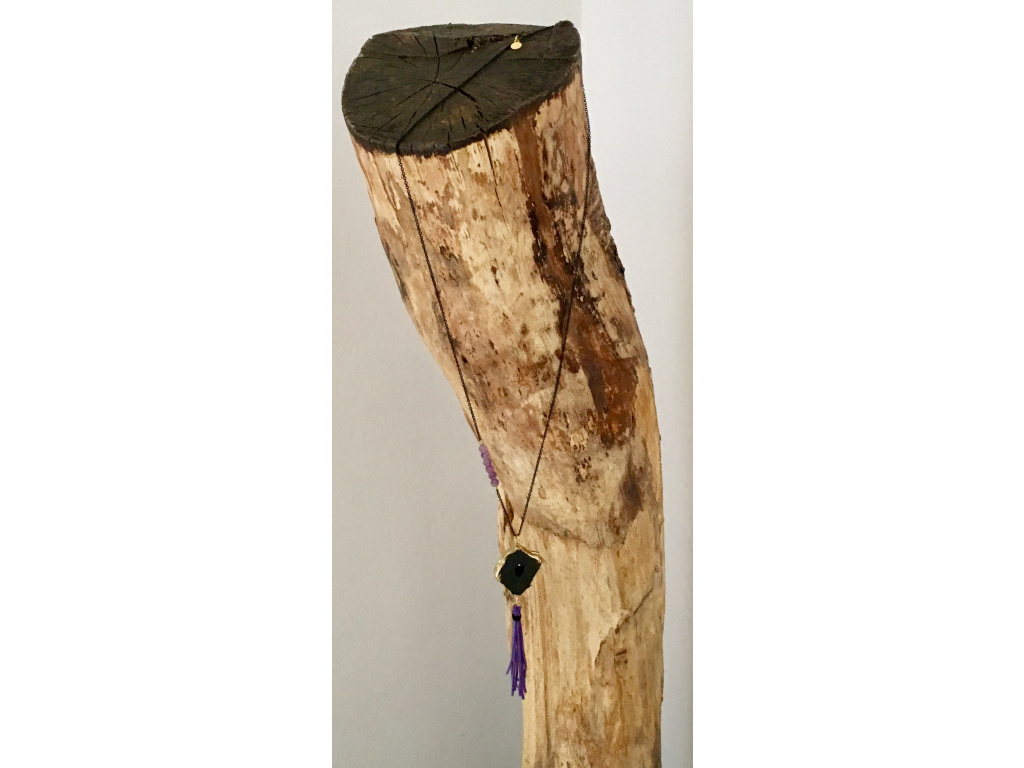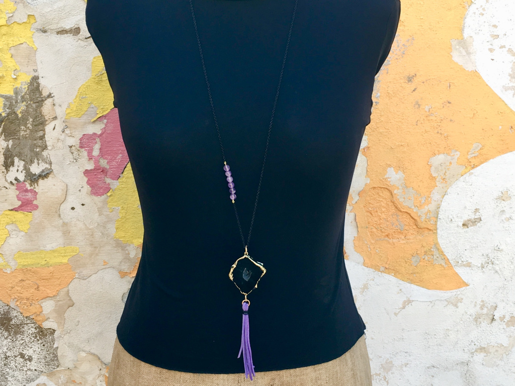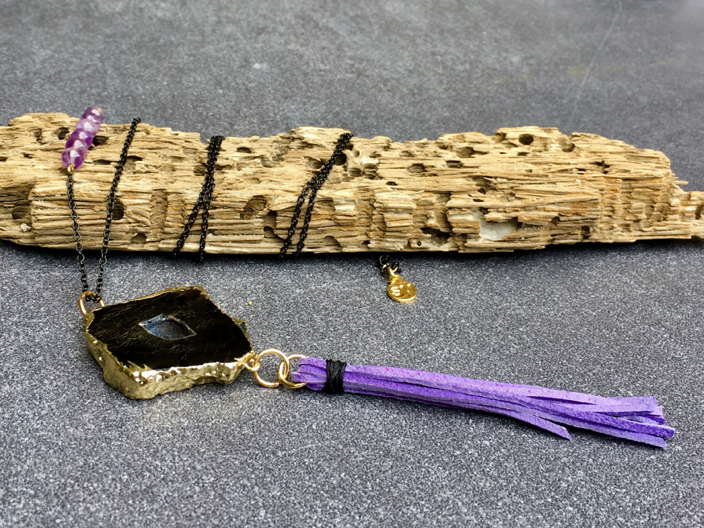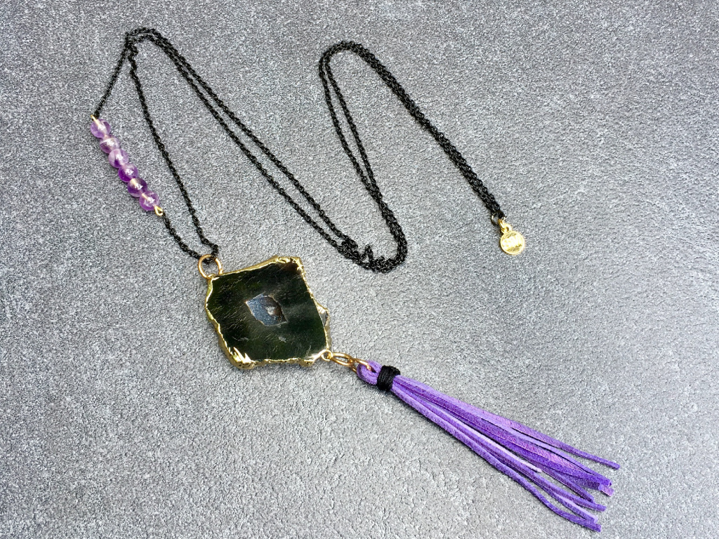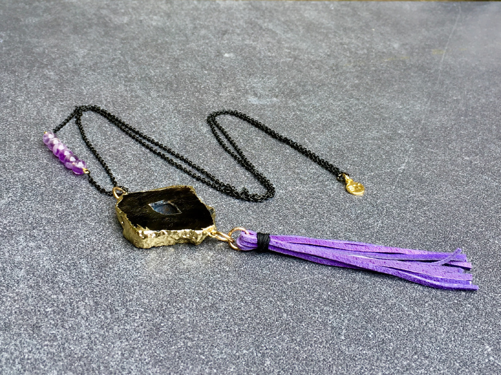 ROZMĚRY: celková délka včetně střapce - 118 cm, ametyst - kulička cca 6 mm, střapec - kůže cca 8,5 cm, achát - geodka cca 4,5 x 4 cm
