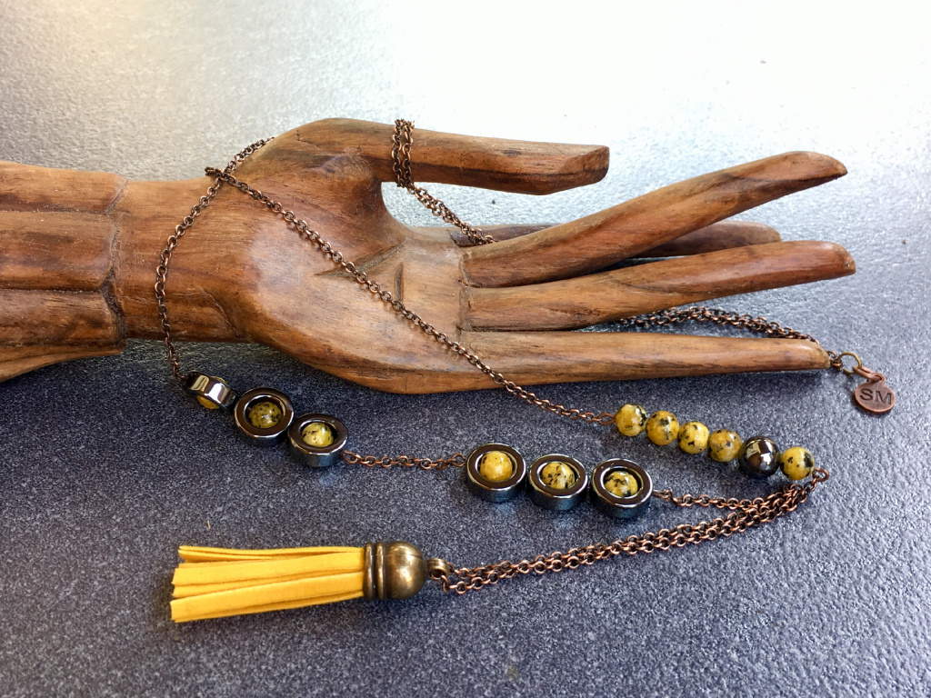 Rozměry: délka včetně přívěsku cca 106 cm, jaspis - kuličky 6 mm, hematit - kulička 8 mm, kroužky 10 mm, délka střapce 4,5 cm